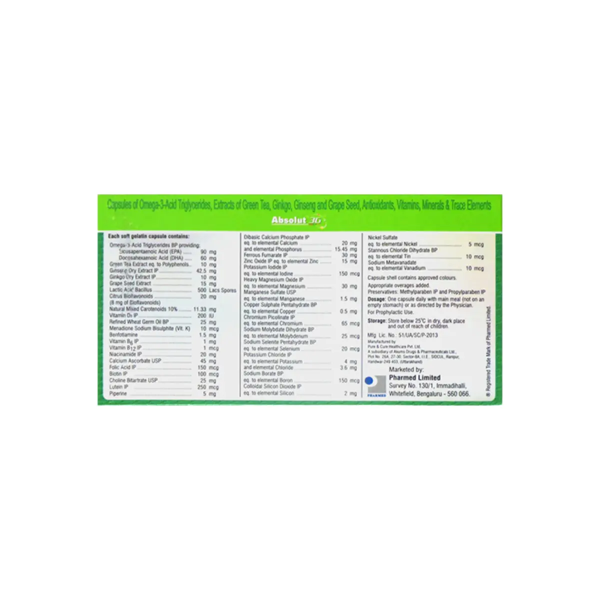 ABSOLUT 3G (Omega 3 Fatty Acids, Biotin, Calcium Ascorbate, Citrus Bioflavonoids, Elemental Calcium, Folic Acid, Gingko Biloba, Grape seed extract, Lactobacillus, Lutein, Niacinamide, Phosphorus, Vitamin B12, Vitamin D3, Vitamin K, Wheat Germ Oil, EPA, DHA, Green Tea Extracts, Ginseng, Natural Mixed Carotenoids, Vitamin B6, Niacinamide, Biotin, Choline Bitartrate, Piperine, Diabasic Calcium Phosphate, Ferrous Fumarate, Zinc Oxide, Potassium Iodide, Magnesium Oxide, Manganese Sulphate, Elemental Copper)