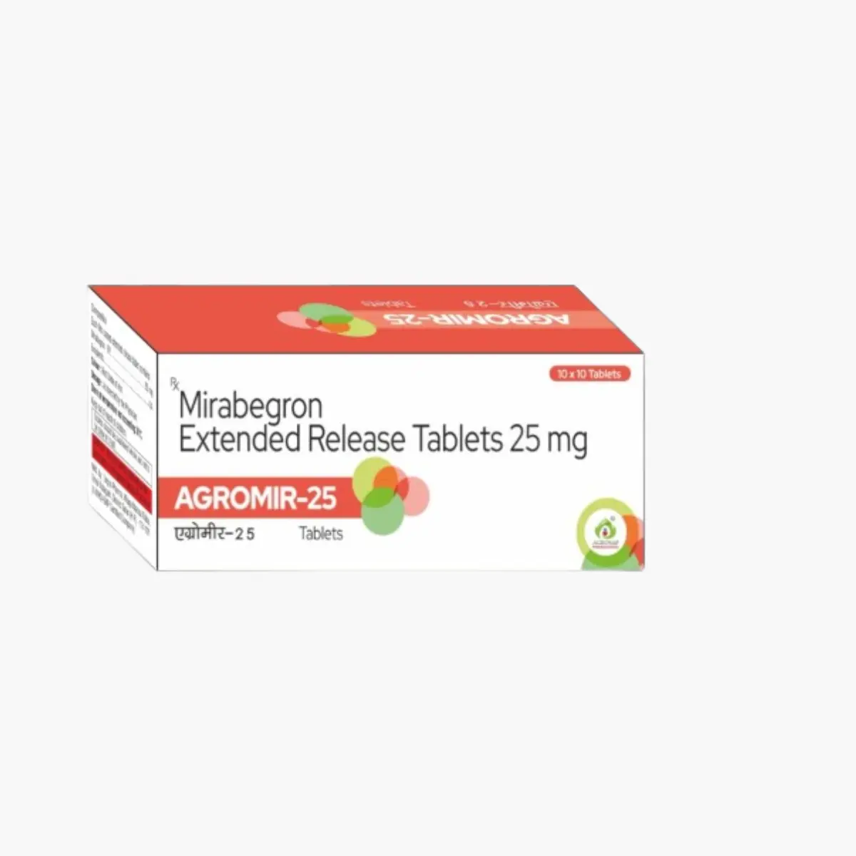 AGROMIIR 25mg Extended Release Tablet is indicated for the management of symptoms associated with overactive bladder, which may include a frequent need to urinate, a strong urge to urinate, and challenges in controlling urination. This medication works by relaxing the muscles surrounding the bladder, enhancing its capability to hold urine. It is essential to follow the prescribed dosage and duration as directed by your healthcare provider. The tablet can be ingested with or without food, and it should be swallowed whole without breaking or chewing. It is advisable not to discontinue use without consulting your healthcare professional, as this could exacerbate your symptoms. Completing the prescribed treatment course is important for optimal results. While some individuals may experience side effects such as constipation, headaches, elevated blood pressure, nasal congestion, urinary tract infections, increased heart rate, and joint discomfort, it is crucial to reach out to your doctor if these effects are bothersome or do not resolve. Prior to starting treatment, inform your healthcare provider about any other medications you are taking. If you are pregnant or nursing, it’s important to discuss this with your doctor before starting AGROMIIR. Patients with pre-existing kidney or liver conditions should proceed with caution and adhere to regular follow-up appointments as advised by their healthcare provider.