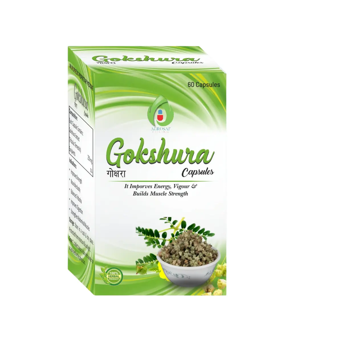 AGROSAF GOKSHURA CAPSULE is a high-quality herbal supplement that contains an extract of Tribulus Terrestris, commonly referred to as Gokshura, at a concentration of 250 mg per capsule. This herbal ingredient has been traditionally recognized for its various health benefits, particularly in promoting urinary tract function, enhancing vitality, and supporting reproductive health. It is particularly suited for use by pharmaceutical distributors, health product retailers, and bulk purchasers who seek reliable Ayurvedic remedies. This formulation is derived from natural sources, making it an appealing choice for individuals looking to integrate herbal supplementation into their wellness routine. The careful selection of ingredients in AGROSAF GOKSHURA CAPSULE ensures that it meets high standards of quality and efficacy, offering a natural approach to health support. Individuals interested in maintaining or improving their health may find this supplement beneficial as it is designed to complement a balanced lifestyle. As with any supplement, it is recommended to consult with a healthcare professional before starting any new regimen, particularly for those with pre-existing health conditions or those taking other medications. Use this medicine only under medical supervision. Follow the dose and schedule exactly as advised. Do not stop abruptly without guidance. Keep a record of any unusual symptoms and share them with your clinician. Combine therapy with appropriate lifestyle measures and routine monitoring as recommended.