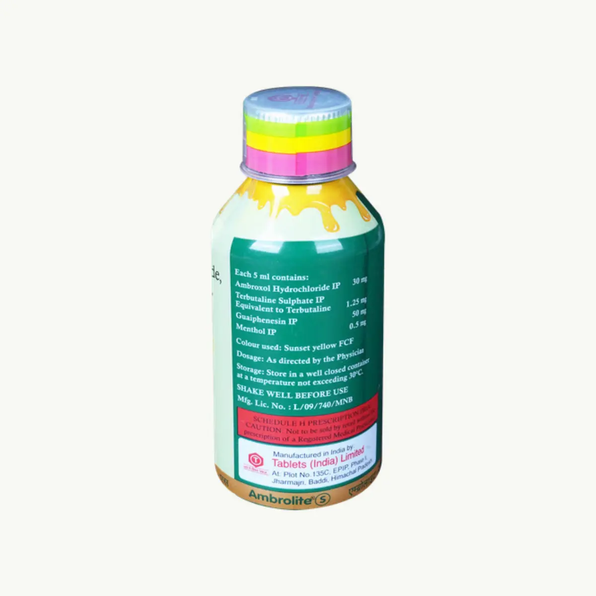 Ambrolite-S Expectorant is a formulation designed to alleviate coughing by facilitating the expulsion of mucus from the respiratory tract. It works by thinning the mucus present in both the nasal passages and the windpipe, thereby easing the process of coughing it out. Additionally, this medication helps to soothe throat irritation and imparts a cooling effect, which can provide relief to the user. Administration of Ambrolite-S can occur with or without food, based on the guidance provided by a healthcare professional. The prescribed dosage and duration of therapy will vary according to the individual’s specific condition and their response to treatment. It is crucial to adhere to the recommended course of this medication, as premature discontinuation may lead to a resurgence of symptoms and a deterioration of the underlying condition. Patients are advised to inform their doctors of any other medications they are currently taking, as potential interactions may exist. While the majority of side effects are temporary and resolve over time, patients should seek medical advice if they have concerns regarding any adverse effects. This medication may also cause drowsiness; therefore, individuals should refrain from driving or engaging in tasks that require full mental alertness until they understand how it impacts them. Staying well-hydrated while using this medication is recommended. Before starting treatment, it is essential for individuals who are pregnant, planning to become pregnant, or breastfeeding to discuss their situation with their healthcare provider.