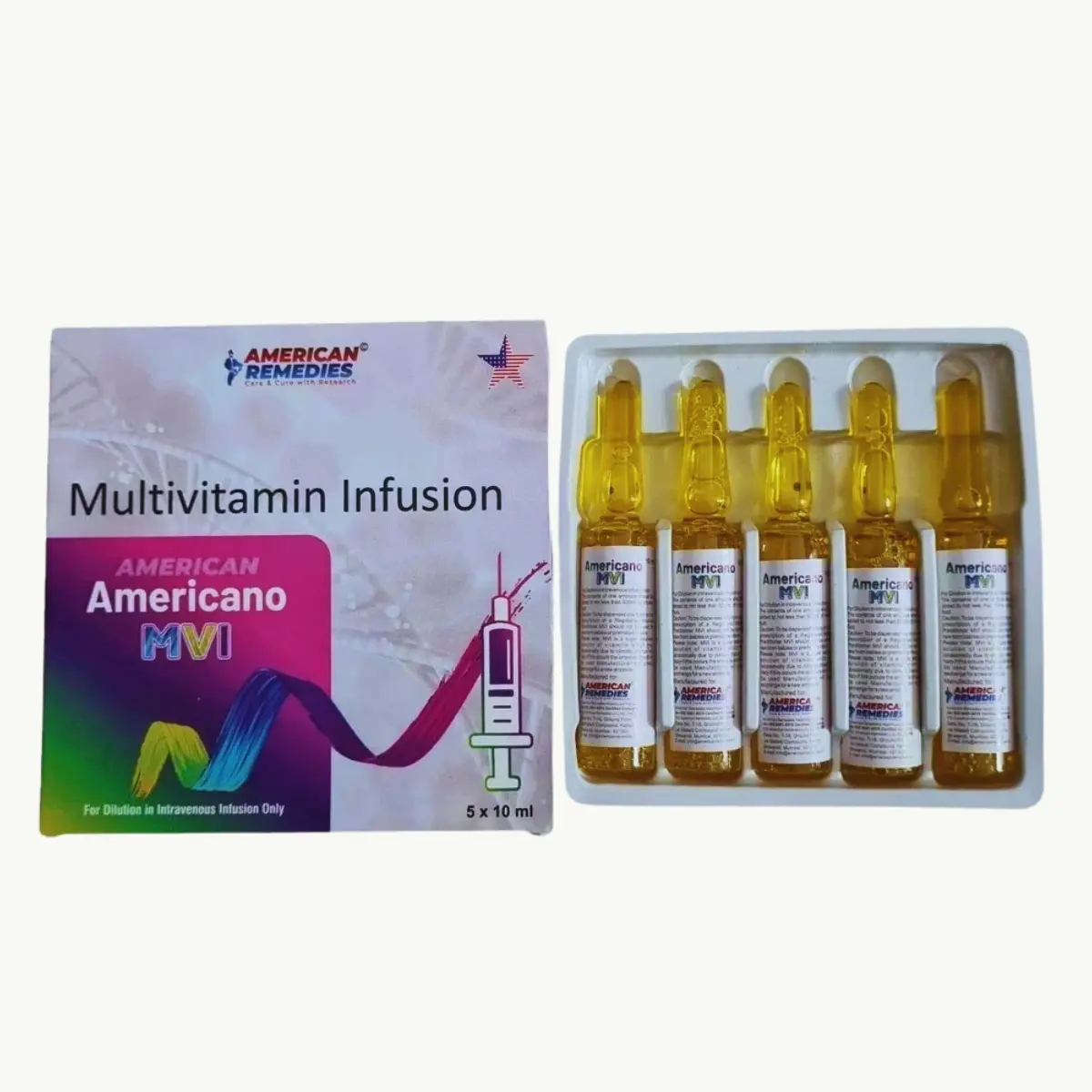 AMERICANO M.V.I. Injection is a prescription medication that combines various vitamins to address deficiencies in essential nutrients. This injection is used to support the body’s overall growth and functionality. It is crucial that this injection is administered by a qualified healthcare provider; self-administration is not recommended. Prior to receiving this treatment, it is important to inform your healthcare professional of any known allergies to the components of this medication. While receiving the injection, some individuals may experience localized reactions such as redness, swelling, or discomfort at the injection site. These symptoms typically diminish over time; however, if they persist or worsen, it is advisable to seek medical attention. Additionally, notify your doctor if you have any pre-existing health conditions or are currently taking other medications, as this information may be relevant for your treatment plan. Use this medicine only under medical supervision. Follow the dose and schedule exactly as advised. Do not stop abruptly without guidance. Keep a record of any unusual symptoms and share them with your clinician. Combine therapy with appropriate lifestyle measures and routine monitoring as recommended. Use this medicine only under medical supervision. Follow the dose and schedule exactly as advised. Do not stop abruptly without guidance. Keep a record of any unusual symptoms and share them with your clinician. Combine therapy with appropriate lifestyle measures and routine monitoring as recommended.