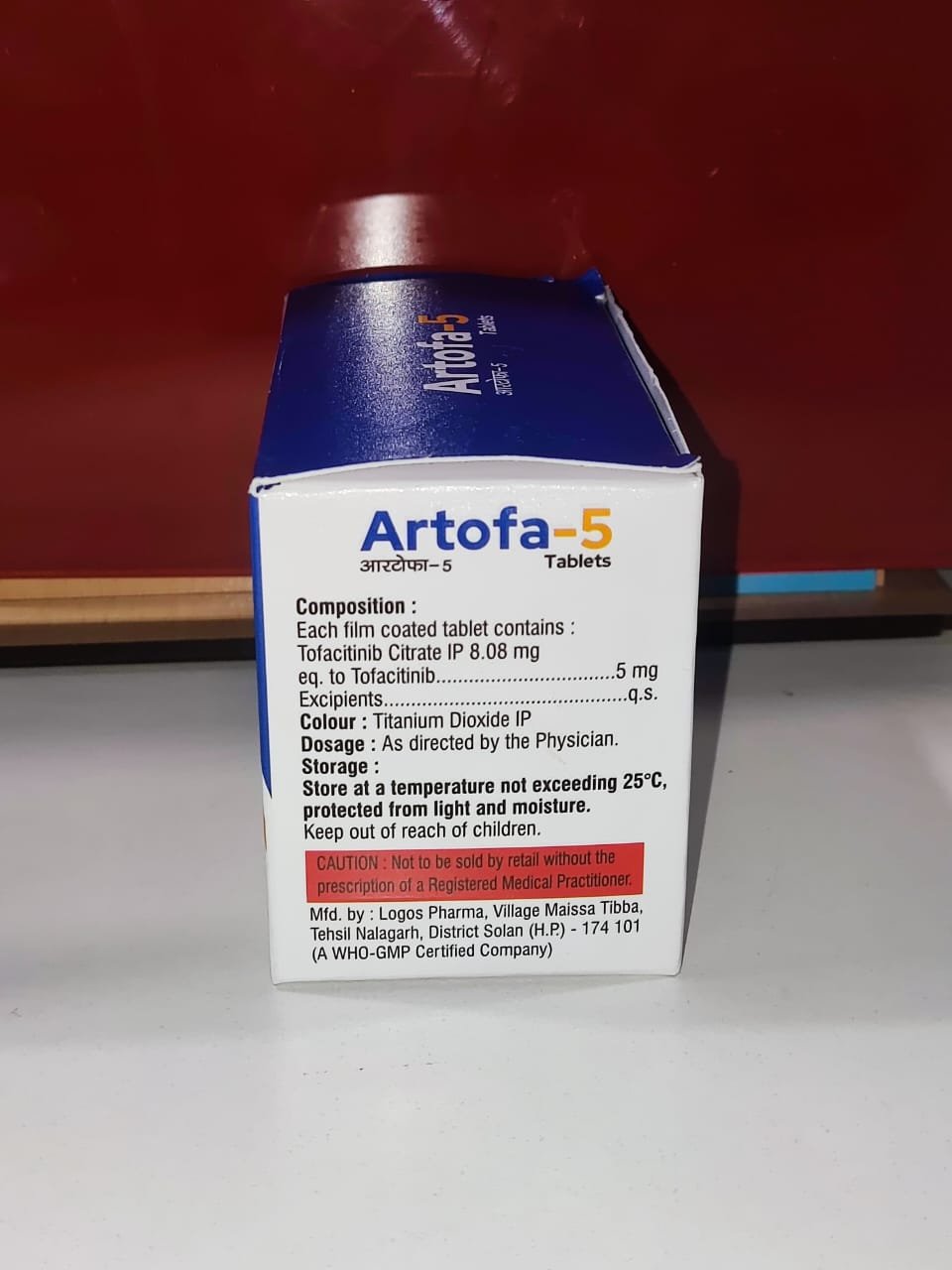 Artofa-5 Tablets contain Tofacitinib 5 mg, a medication used primarily to treat rheumatoid arthritis, psoriatic arthritis, and ulcerative colitis. Tofacitinib is a Janus kinase (JAK) inhibitor that helps reduce inflammation by targeting specific enzymes involved in the inflammatory process. These tablets are effective in improving joint function, reducing pain, and managing symptoms associated with chronic inflammatory conditions.