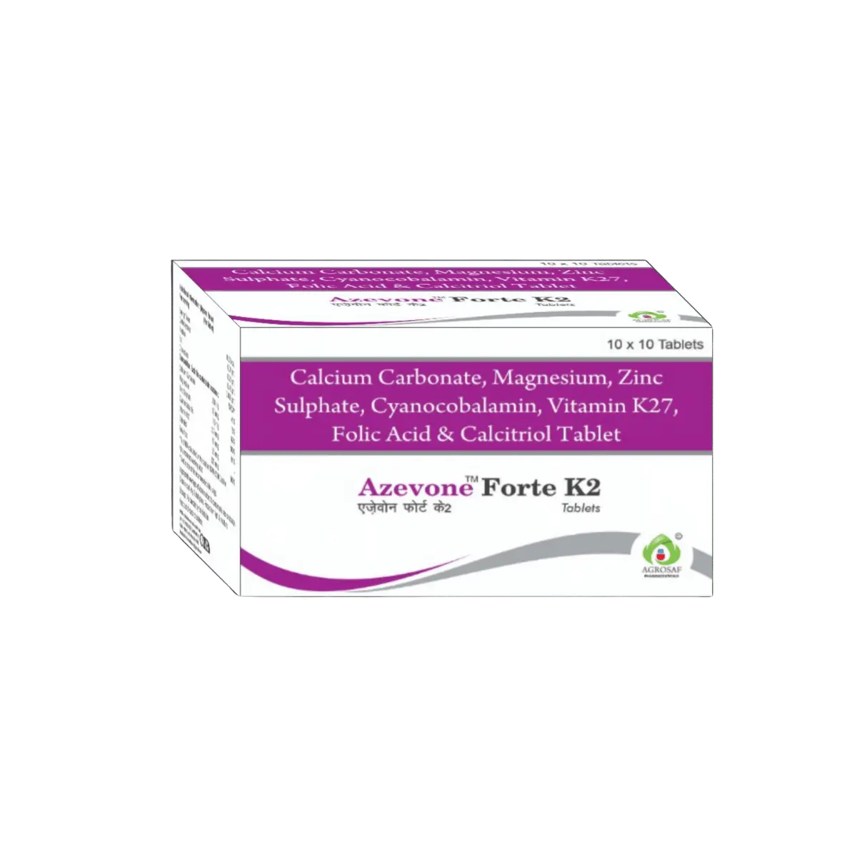 AZEVONE FORTE K2 TABLET is a dietary supplement formulated to support overall health and wellness. It contains a blend of vitamins and minerals specifically designed to provide essential nutrients that may aid in maintaining bodily functions. While the exact mechanism of action may vary, the ingredients work synergistically to promote optimal health. This product is intended for individuals seeking a supplement to enhance their dietary intake of crucial elements. It is important to adhere to the recommended dosage to achieve the best results and ensure safety. Individuals should consider consulting with a healthcare provider before beginning any new supplement regimen, especially if they have pre-existing health conditions or are taking other medications. Regular use, as directed, may contribute positively to one’s nutritional status, but it should not be considered a replacement for a balanced diet. Users should also be aware of any potential interactions with other supplements or medications they may be taking. Keeping the product in a cool, dry place and away from children is advised. Always check the expiration date and do not consume if the seal is broken. Use this medicine only under medical supervision. Follow the dose and schedule exactly as advised. Do not stop abruptly without guidance. Keep a record of any unusual symptoms and share them with your clinician. Combine therapy with appropriate lifestyle measures and routine monitoring as recommended.