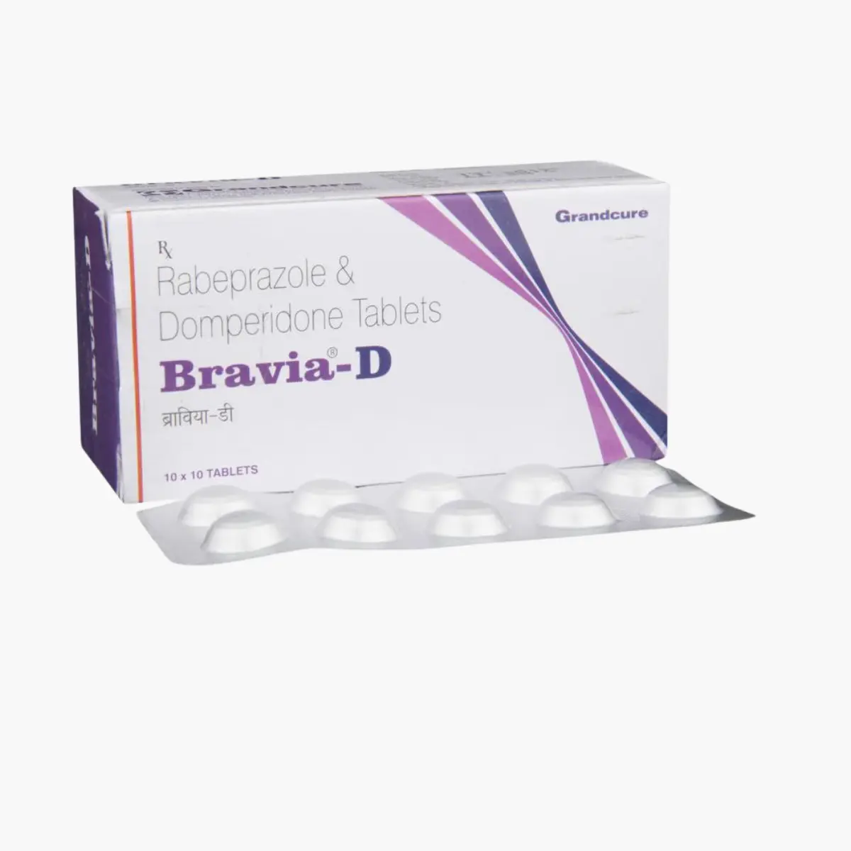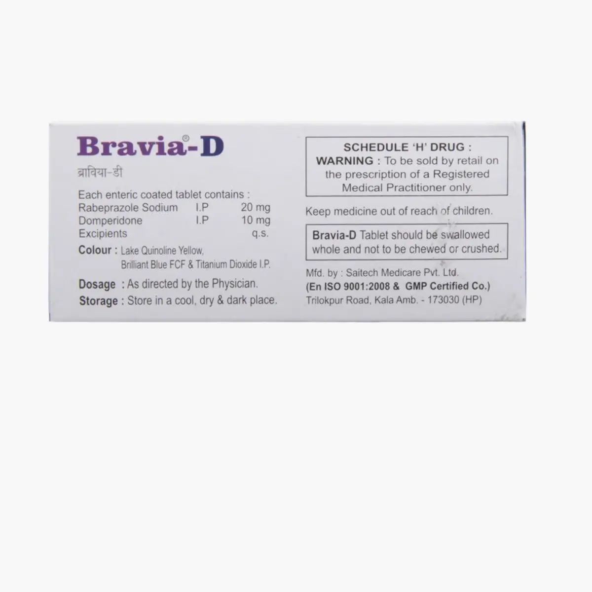 The active ingredients in BRAVIA D are Domperidone and Rabeprazole. Domperidone works by blocking certain signals in the brain that cause nausea and vomiting, while Rabeprazole reduces the production of stomach acid. Together, they aim to provide relief from symptoms associated with stomach irritation and acid reflux.