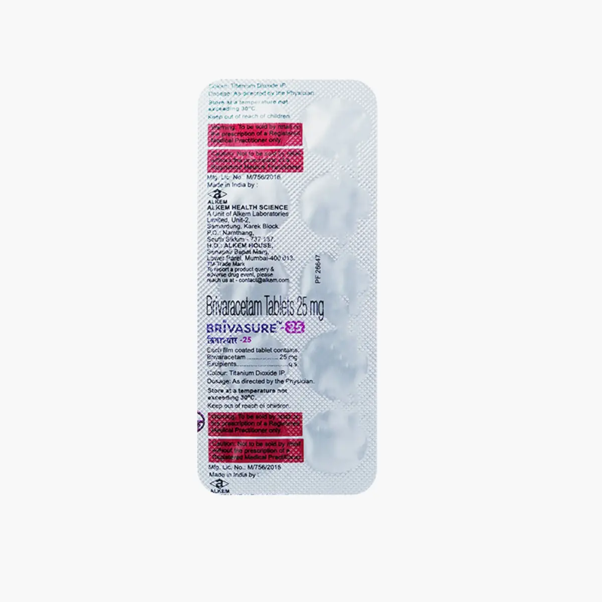 Brivasure 25mg Tablet is a medication classified as an anti-epileptic agent, primarily utilized for the management of seizures associated with epilepsy. This medication can be prescribed on its own or in conjunction with other treatments. By addressing the irregular electrical activity occurring in the brain, Brivasure works to mitigate the occurrence of seizures as long as the medication is taken consistently. Patients are advised to follow a regular dosing schedule, either with or without food, ideally at the same time each day to achieve optimal therapeutic effects. The prescribing physician will determine the appropriate dosage and frequency based on individual needs, with possible gradual adjustments to ensure adequate control of seizures. It is crucial that patients adhere to their treatment plan as directed by their healthcare provider, even if they experience an improvement in their condition. Discontinuation or missed doses may lead to an exacerbation of seizures. Abruptly stopping the medication without medical guidance can also result in a detrimental increase in seizure activity. Regular monitoring and communication with the healthcare provider are essential throughout the course of treatment to manage any potential side effects effectively and to make informed decisions regarding ongoing use. Use this medicine only under medical supervision. Follow the dose and schedule exactly as advised. Do not stop abruptly without guidance. Keep a record of any unusual symptoms and share them with your clinician. Combine therapy with appropriate lifestyle measures and routine monitoring as recommended.