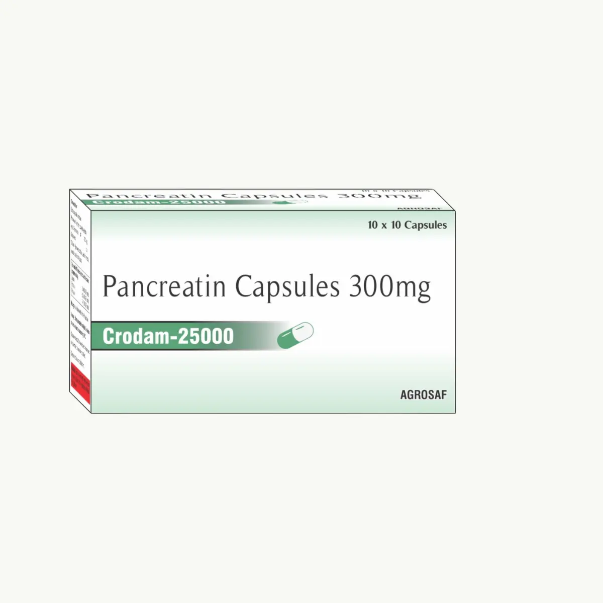 CRODAM 25000 Capsule is indicated for the management of pancreatic enzyme insufficiency. This product functions as a supplement that aids in the digestive process by providing essential enzymes that the pancreas is unable to produce adequately. The administration of this capsule can lead to a decrease in the frequency of stools and alleviate discomfort in the abdominal region. It is recommended that the capsule be ingested with a meal or a snack, accompanied by a generous amount of water to ensure effective mixing of the enzymes with food. The prescribed dosage will vary based on individual medical conditions and the patient’s response to the therapy. It is crucial to adhere to the treatment regimen as directed by your healthcare provider and continue taking the medication until they advise otherwise. For some patients, long-term usage might be necessary, thus establishing a consistent routine is advisable. In addition to taking CRODAM 25000, patients may need to follow a specialized diet as part of their comprehensive treatment plan. Should any intolerable side effects arise, such as abdominal pain, bloating, or diarrhea, it is essential to communicate these concerns to your physician, as there may be strategies to mitigate them. Use this medicine only under medical supervision. Follow the dose and schedule exactly as advised. Do not stop abruptly without guidance. Keep a record of any unusual symptoms and share them with your clinician. Combine therapy with appropriate lifestyle measures and routine monitoring as recommended.