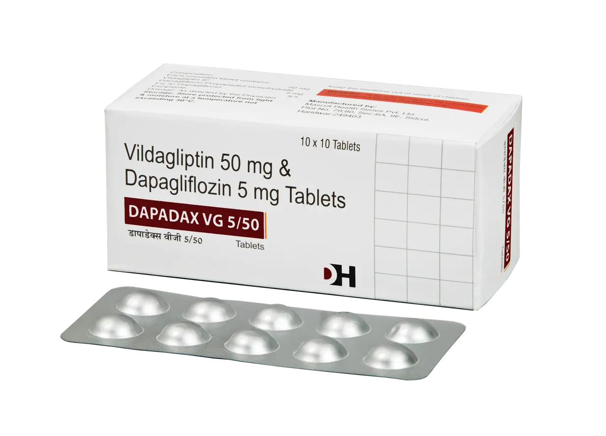 DAPADAX VG 5/50 is a pharmaceutical formulation that combines two active components: Dapagliflozin at a dosage of 5 mg and Vildagliptin at 50 mg. This combination is designed to support the management of type 2 diabetes mellitus. Dapagliflozin belongs to the class of medications known as SGLT2 inhibitors, which function by promoting the removal of glucose from the bloodstream through urine. This mechanism aids in lowering overall blood sugar levels. On the other hand, Vildagliptin is classified as a DPP-4 inhibitor. It works by increasing levels of incretin hormones, which in turn boosts insulin secretion when food is consumed and decreases glucagon levels, helping to stabilize blood glucose levels after meals. The synergistic effect of these two medications contributes to better glycemic control and can potentially lower the likelihood of complications associated with diabetes. Patients using DAPADAX VG 5/50 should do so under the guidance of a healthcare provider, as regular monitoring of blood sugar levels and overall diabetes management will be necessary to ensure optimal efficacy and safety. Use this medicine only under medical supervision. Follow the dose and schedule exactly as advised. Do not stop abruptly without guidance. Keep a record of any unusual symptoms and share them with your clinician. Combine therapy with appropriate lifestyle measures and routine monitoring as recommended.