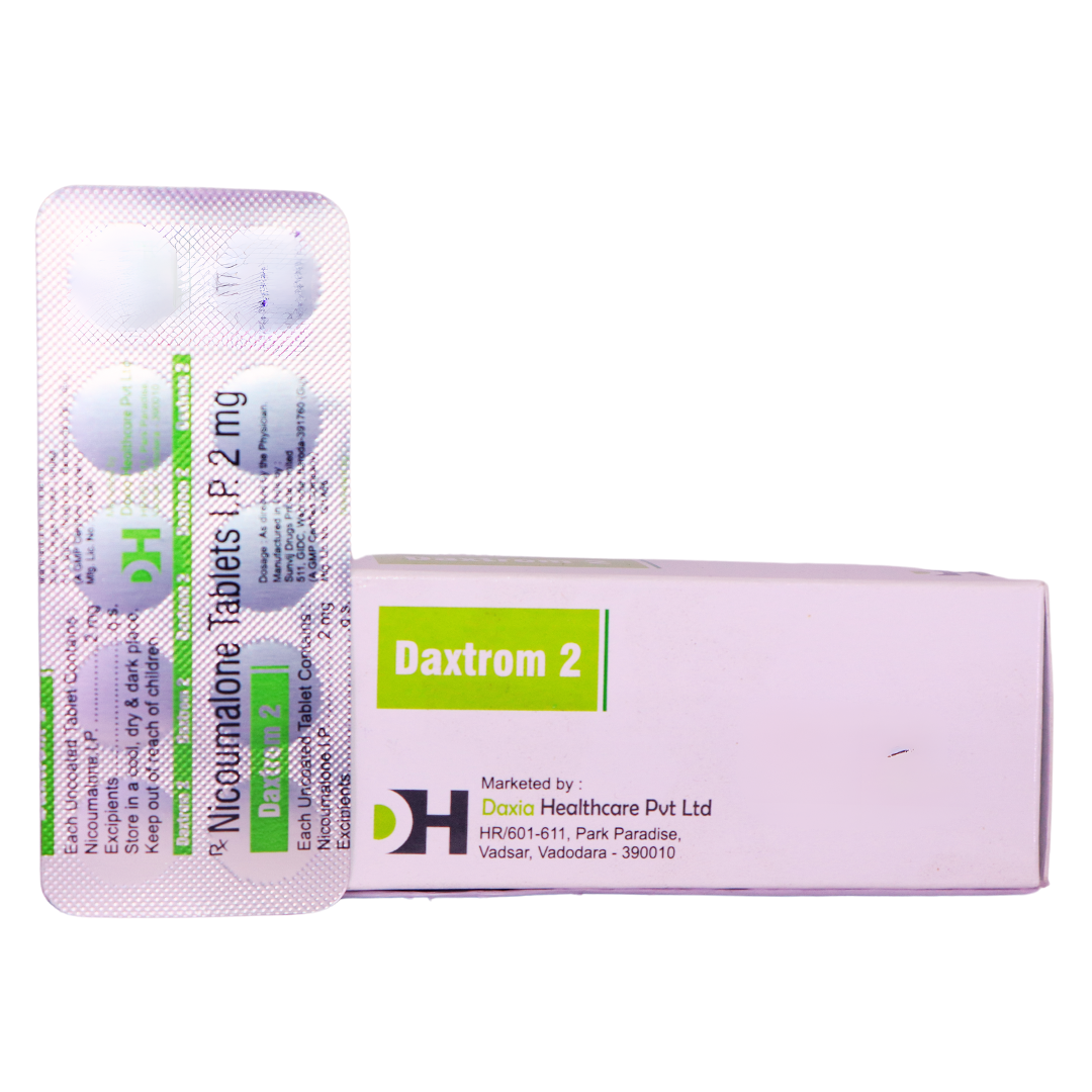 Daxtrom 2 (Nicoumalone 2 mg) is an anticoagulant medication primarily used to prevent and treat thromboembolic disorders such as deep vein thrombosis (DVT) and pulmonary embolism (PE). It functions by inhibiting the synthesis of vitamin K-dependent clotting factors thereby reducing the ability of the blood to clot. Daxtrom 2 is often prescribed for patients at risk of clot formation providing effective management of various conditions that require anticoagulation therapy.