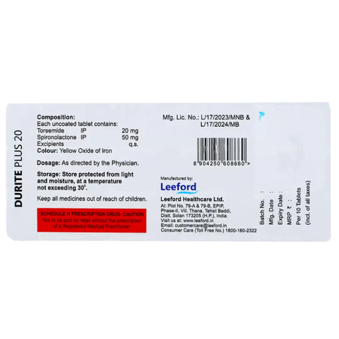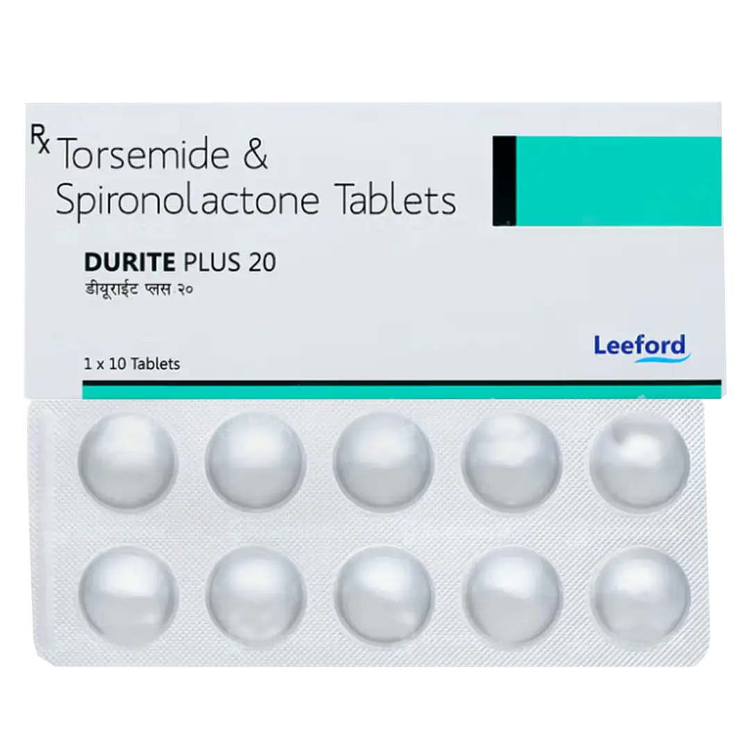 The active ingredients in DURITE PLUS are Spironolactone and Torsemide. Spironolactone works as a diuretic, which means it helps the body eliminate excess salt and water through urine. On the other hand, Torsemide is also a diuretic that has a similar effect, working to remove excess fluid from the body. Together, these ingredients aim to effectively support the management of edema and related symptoms.