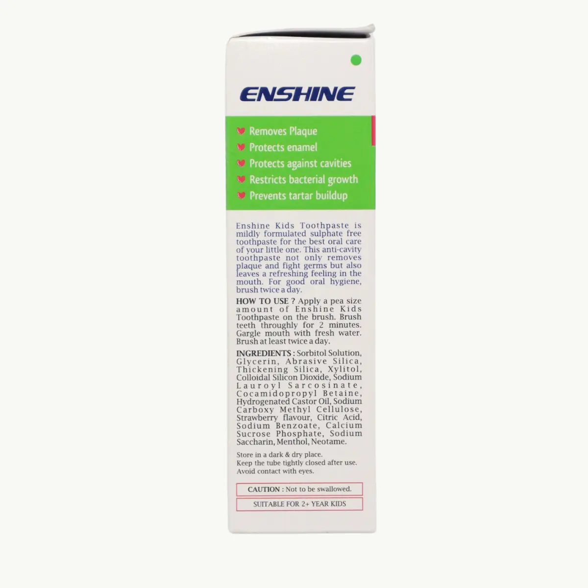 Enshine Kids Toothpaste Strawberry is specially designed to provide gentle oral care for children. This toothpaste is free from sulfates, ensuring that it protects sensitive mouths while effectively combating cavity formation and plaque buildup. It works by eliminating harmful bacteria within the mouth and leaves a pleasant, refreshing sensation that encourages children to maintain good dental hygiene. Parents are advised to incorporate this toothpaste into their children’s daily routine by brushing their teeth twice a day. Enshine Kids Toothpaste not only assists in the prevention of cavities and plaque but also promotes healthy oral care practices from an early age, making teeth brushing an enjoyable experience for young ones. The product’s appealing strawberry flavor and eye-catching packaging help attract children and encourage them to participate in their dental health. This toothpaste features a gentle formulation that is free from harsh additives, making it suitable for children’s delicate mouths. Key ingredients include Sorbitol Solution, Glycerin, and Xylitol, among others, which work together to ensure both safety and efficacy while maintaining good oral hygiene. Parents can be confident in choosing this toothpaste as part of their child’s daily dental care regimen. Use this medicine only under medical supervision. Follow the dose and schedule exactly as advised. Do not stop abruptly without guidance. Keep a record of any unusual symptoms and share them with your clinician. Combine therapy with appropriate lifestyle measures and routine monitoring as recommended.