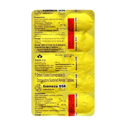ESOMEZA DSR Capsule is a prescribed medication intended for the management of gastroesophageal reflux disease (GERD) and symptoms related to indigestion, including heartburn, abdominal discomfort, and irritation. This formulation works by neutralizing stomach acid, facilitating the passage of gas, and alleviating discomfort within the stomach. It is essential to take the capsule without food, adhering strictly to the dosage and duration prescribed by your healthcare provider. Individual dosages may vary based on your specific health condition and your response to the treatment. It is crucial to continue taking this medication for as long as recommended by your physician, as premature discontinuation could lead to a resurgence of symptoms or a worsening of your condition. Additionally, inform your healthcare provider about any other medications you are currently taking, as interactions may occur that could affect the efficacy or safety of this medication. While many side effects are typically temporary and resolve over time, it is advisable to reach out to your doctor if you have concerns regarding any adverse effects. This medication may also induce drowsiness or dizziness, hence it is advised to refrain from driving or engaging in tasks that require full attention until you understand how the medication impacts you. Lifestyle changes, such as consuming cold milk and avoiding hot beverages, spicy foods, and chocolate, may enhance treatment effectiveness.