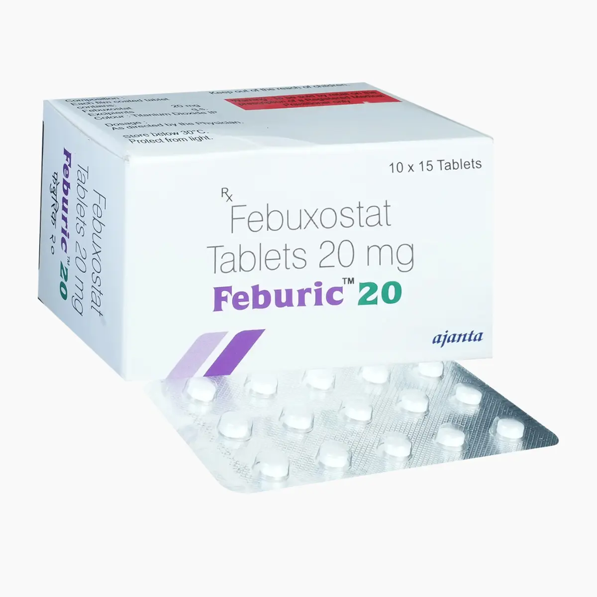 Feburic 20 mg Tablet is intended for the management and prevention of gout, a condition characterized by elevated levels of uric acid in the body. When uric acid accumulates, it can crystallize and settle around joints, resulting in discomfort and inflammation. This medication aids in maintaining lower uric acid levels, thereby helping to alleviate symptoms associated with gout. It can be administered with or without meals, and it is crucial to continue the medication as directed by a healthcare professional, even during periods without active gout attacks. Discontinuing use may lead to exacerbation of symptoms due to the potential for increased crystal formation. Patients are encouraged to adopt dietary adjustments, such as limiting alcohol and avoiding certain non-vegetarian foods, while also ensuring adequate hydration. Some individuals may experience transient worsening of gout symptoms, including acute pain and redness in the affected joint, when starting the treatment. However, it is important not to cease taking the medication abruptly. If necessary, a healthcare provider may recommend pain relief medications or additional treatments. Any signs of liver dysfunction, such as ongoing nausea, dark urine, or jaundice, should be reported to a doctor immediately. Prior to initiating therapy, it is essential to inform the physician of any pre-existing conditions, particularly cardiac issues, stroke history, thyroid disorders, or renal and hepatic impairments. Regular monitoring through blood tests is advised to assess liver function during the treatment period.