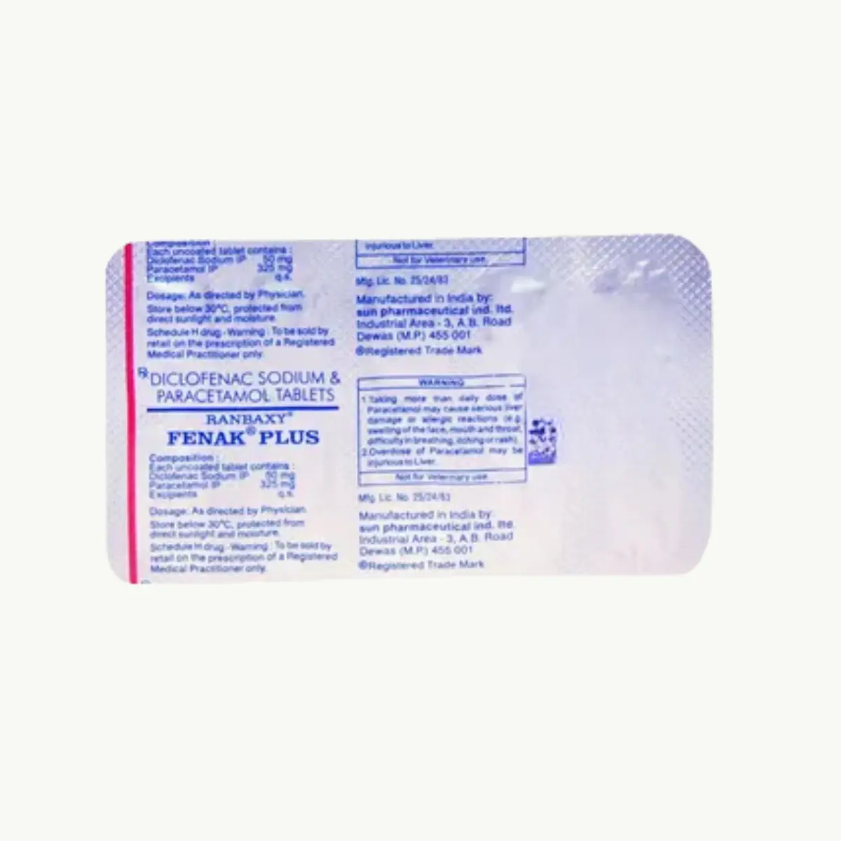 The active ingredients in FENAK PLUS are Diclofenac and Paracetamol. Diclofenac is a non-steroidal anti-inflammatory drug (NSAID) that works by reducing inflammation and blocking pain signals in the body. Paracetamol, on the other hand, helps to lower fever and alleviate pain by acting on the brain’s pain and temperature regulation centers. Together, these ingredients provide a comprehensive approach to pain management.