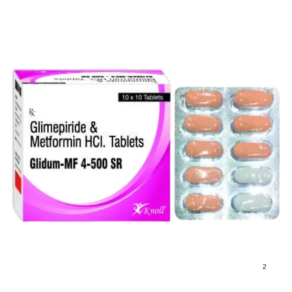Glidum MF 4mg/500mg Tablet SR is categorized as an anti-diabetic medication, utilized primarily for managing type 2 diabetes mellitus in adult patients. This formulation combines two active ingredients that work synergistically to help maintain appropriate blood sugar levels in individuals with diabetes. To achieve optimal results, it is advised to take the tablet alongside food and to adhere to a consistent daily schedule for dosing as prescribed by your healthcare provider. The specific dosage will be tailored to your individual needs and may be subject to adjustments based on your ongoing blood sugar monitoring. It is crucial to continue the medication regimen even if you feel well or your blood sugar appears stable; abrupt discontinuation without medical guidance could result in elevated blood sugar levels, increasing the risk of serious complications such as kidney damage, vision loss, nerve issues, and amputations. The management of diabetes should be seen as a multifaceted approach that also includes a balanced diet, routine physical activity, and weight management as recommended by your healthcare professional. Awareness of lifestyle factors is essential in achieving effective diabetes control. A notable adverse effect linked to Glidum MF 4mg/500mg Tablet SR is hypoglycemia, or low blood sugar; therefore, recognizing symptoms like sweating, dizziness, and tremors is vital. To mitigate this risk, maintaining regular meal patterns and keeping a rapid source of glucose, such as sugary snacks or juice, readily available is important. Alcohol consumption may further elevate the risk of hypoglycemia and should be avoided. Additional possible side effects include changes in taste, nausea, diarrhea, abdominal discomfort, headaches, and respiratory infections. Weight gain may also occur in some individuals. It is important to avoid use in patients with type 1 diabetes, diabetic ketoacidosis, or severe renal or hepatic impairment. Patients with a history of heart disease should consult a physician prior to commencing this treatment. Regular blood sugar monitoring and potential blood tests for cell counts and liver function are recommended while on this medication.