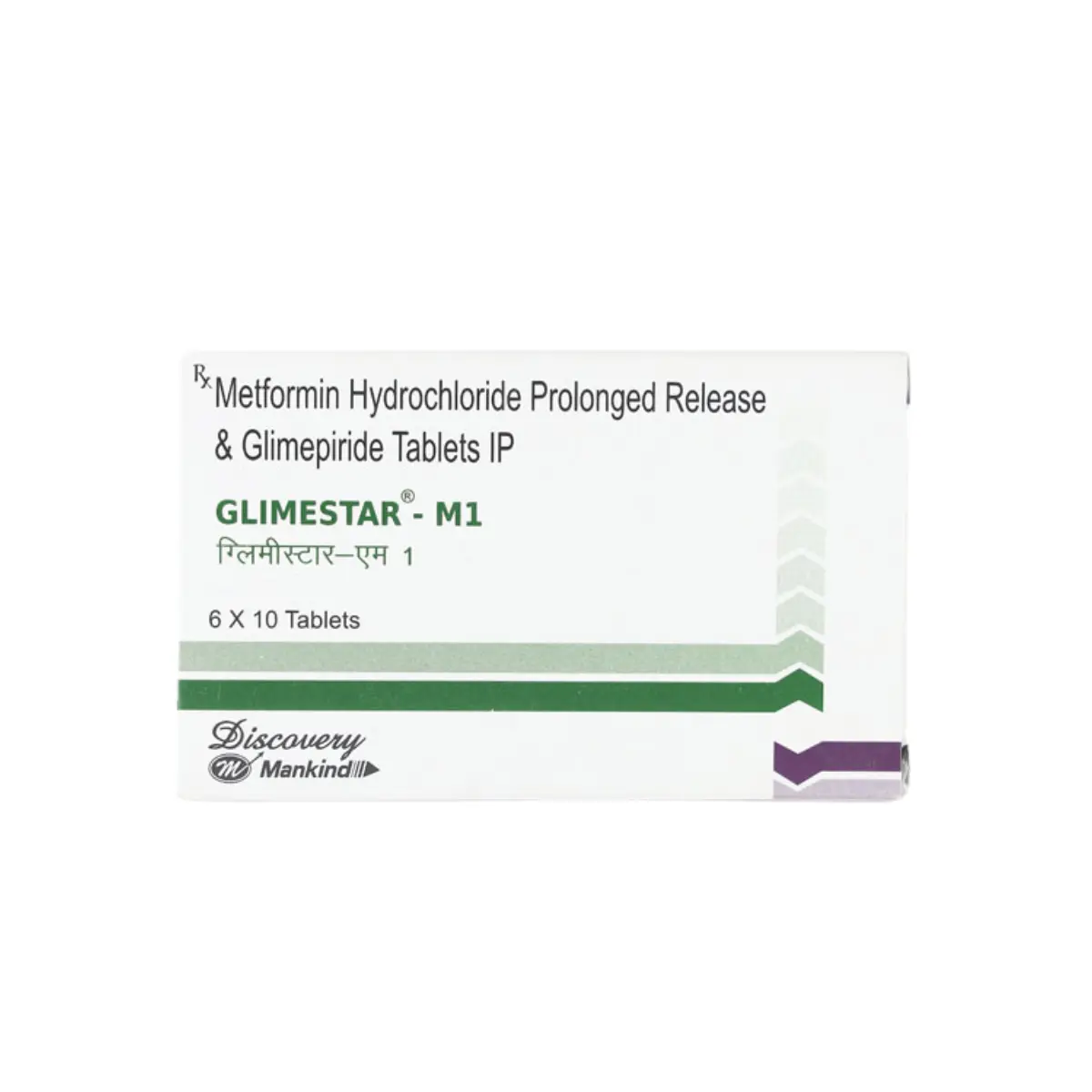 Glimestar M1 Tablet is indicated for the management of type 2 diabetes mellitus. This medication combines two active ingredients: Glimepiride and Metformin. These components work synergistically to effectively reduce elevated blood sugar levels. Glimepiride enhances the secretion of insulin from the pancreas, while Metformin contributes by decreasing glucose production in the liver and improving insulin sensitivity in peripheral tissues. This combination therapy is typically considered when lifestyle modifications, such as diet and physical activity, prove insufficient in achieving glycemic control. It is crucial to adhere to the prescribed dosage and timing; it is recommended to take the tablet after meals to optimize its absorption and efficacy. Regular follow-up with your healthcare provider is essential, as they may adjust the dosage based on your ongoing blood sugar monitoring and response to treatment. Prior to initiating therapy, inform your healthcare provider of any pre-existing medical conditions or other medications you may be taking. Should you experience any adverse effects during treatment, it is important to report these to your healthcare provider without delay. For the best therapeutic outcomes, it is necessary to continue the medication for the duration specified by your doctor. Use this medicine only under medical supervision. Follow the dose and schedule exactly as advised. Do not stop abruptly without guidance. Keep a record of any unusual symptoms and share them with your clinician. Combine therapy with appropriate lifestyle measures and routine monitoring as recommended.