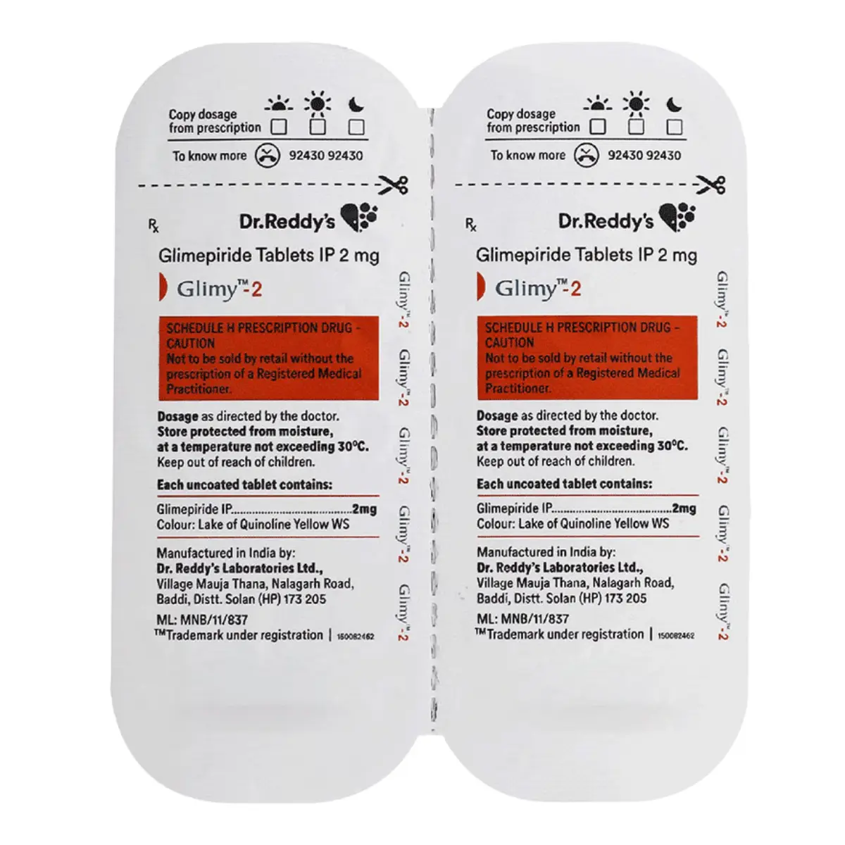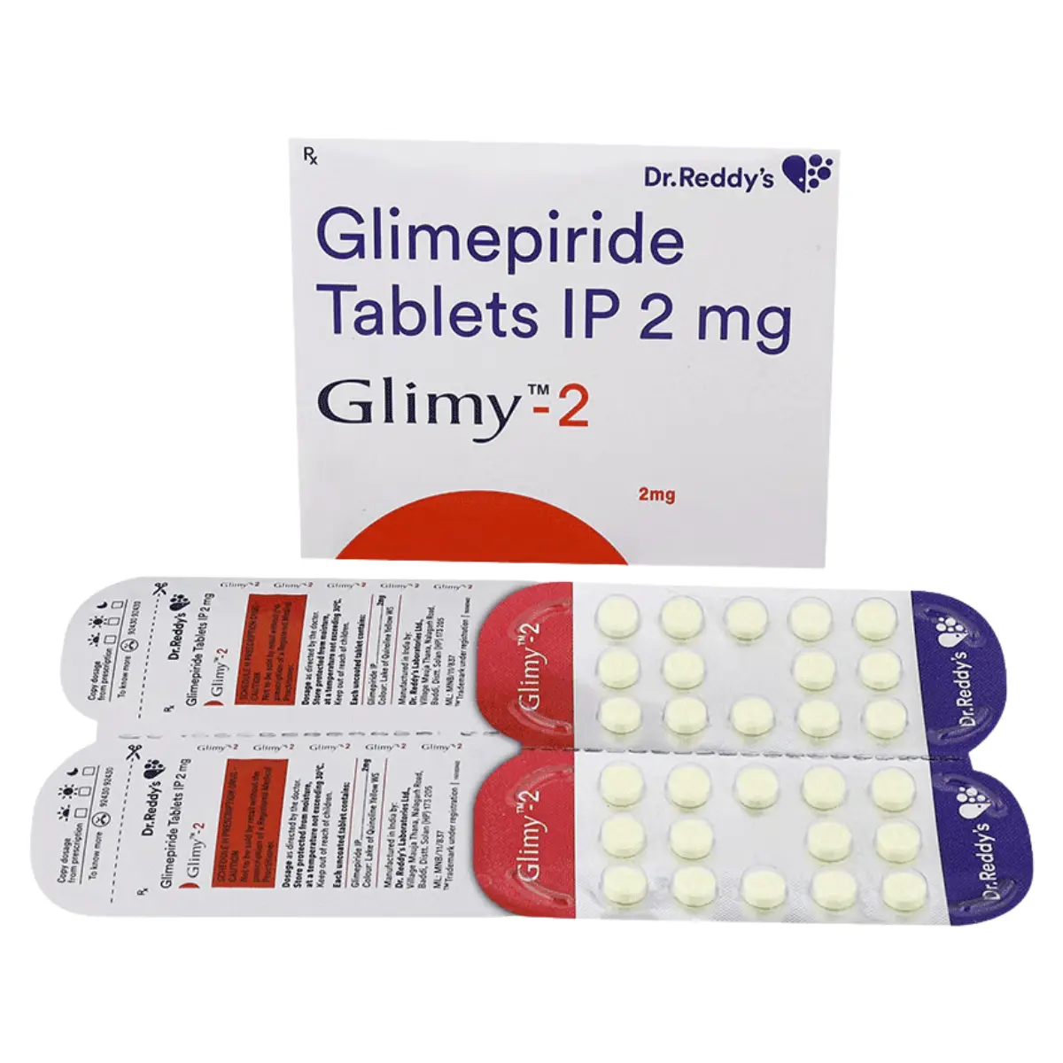 Glimy 2 Tablet is classified within the sulfonylureas category of medications and is prescribed for the management of type 2 diabetes mellitus in adult patients. This medication assists in regulating blood glucose levels, thereby reducing the risk of serious diabetes-related complications, such as renal impairment and visual disturbances. Glimy 2 Tablet can be utilized independently or in combination with other diabetes medications. It is advised to take it shortly before or with the initial meal of the day to optimize its effectiveness. Consistency in taking the medication daily at the same time is crucial to achieve the best therapeutic outcomes. Your healthcare provider will determine the appropriate dosage based on your individual blood glucose levels, and adjustments may be required over time as your condition evolves. It is important to continue using Glimy 2 Tablet, even if you feel stable or your blood sugar appears well-regulated. Discontinuing the medication without professional guidance may lead to elevated blood sugar levels, increasing the risk of complications such as renal damage, visual impairment, neuropathy, and potentially limb loss. This medication is part of a broader diabetes management plan that should also emphasize a nutritious diet, regular physical activity, and weight management as directed by your healthcare provider, as these lifestyle factors significantly influence diabetes control.