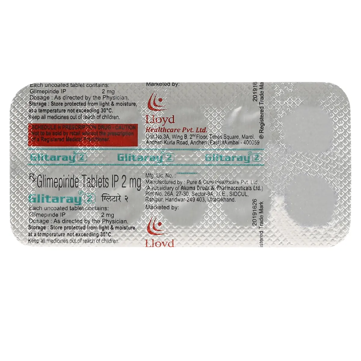 Glitaray 2 mg Tablet is categorized as a sulfonylurea, a class of medications utilized for the management of type 2 diabetes mellitus in adults. This medication assists in regulating blood sugar levels in individuals diagnosed with diabetes, thereby reducing the risk of severe diabetic complications such as renal impairment and vision loss. Glitaray 2 mg can be administered on its own or in conjunction with other diabetic treatments. It is recommended to take this medication shortly before or during the first meal of the day for optimal effects. Consistent daily intake at the same time is important to maximize effectiveness. The appropriate dosage will be determined by your healthcare provider, who may adjust it according to your blood glucose monitoring results. It is crucial to continue taking Glitaray 2 mg even if you feel well or if your blood sugar levels appear to be stable. Discontinuing the medication without medical advice can lead to increased blood sugar concentrations, elevating the risk of complications like nephropathy, vision problems, neuropathy, and potential limb loss. It’s important to remember that this medication is just one component of a broader diabetes management strategy that should include a nutritious diet, regular physical activity, and weight management, as guided by your healthcare professional. Lifestyle choices play a significant role in the effective management of diabetes. Potential side effects associated with Glitaray 2 mg may include low blood sugar (hypoglycemia), nausea, headaches, feelings of weakness, and dizziness. Being aware of symptoms indicative of low blood sugar is essential, including sweating, dizziness, headaches, and tremors, and knowing how to address these symptoms is critical. Regular meals and having a quick source of glucose, like sugary snacks or juice, on hand can help mitigate these risks. Moreover, consuming alcohol may heighten the risk of hypoglycemia, thus should be avoided. Some individuals may also notice weight gain while on this medication.
