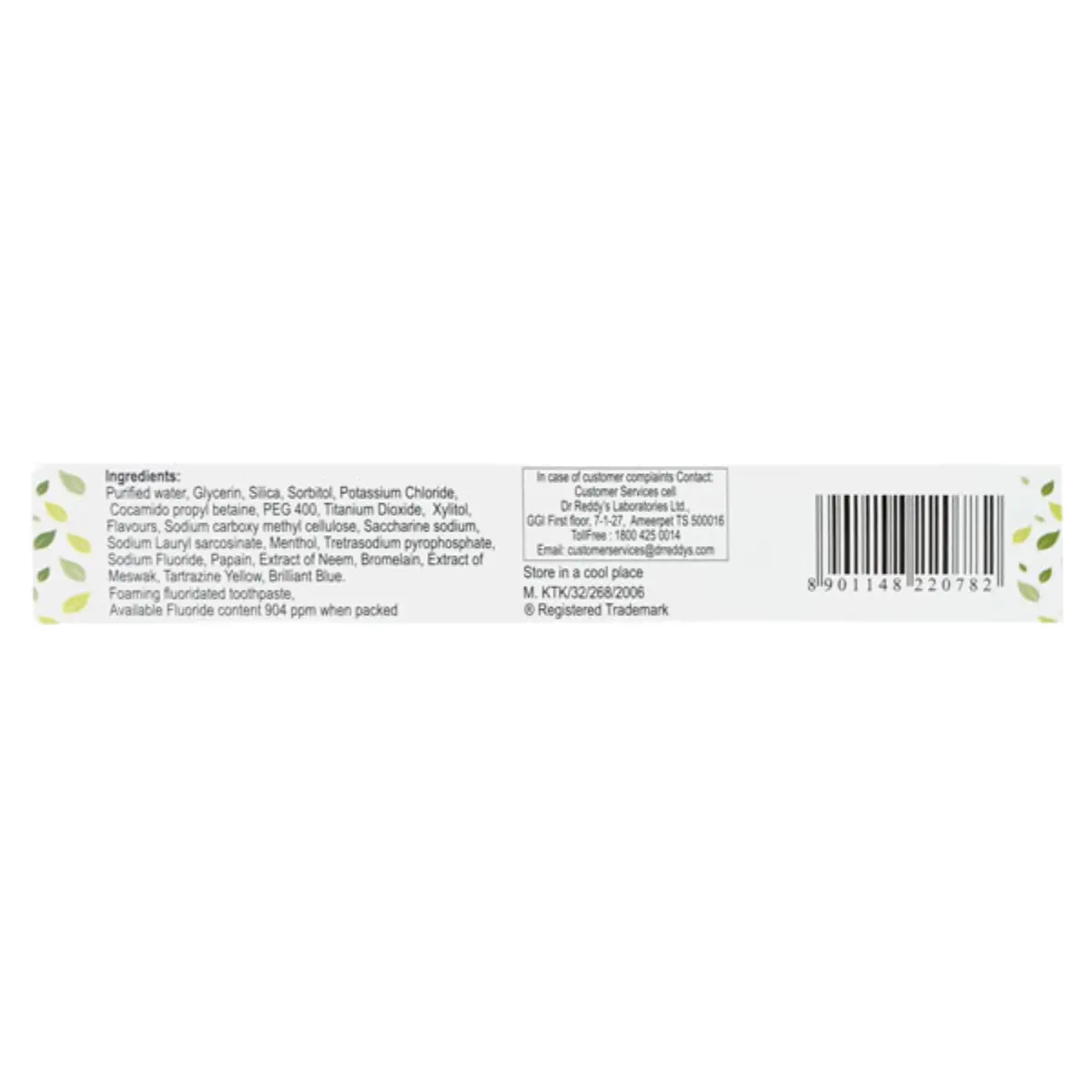 GLIZER (Glycerin, Aqua, Silica, Sorbitol, Flavour, Potassium Chloride, Cocoamidopropyl Betaine, PEG 400, Titanium Dioxide, Xylitol, Sodium Carboxymethyl Cellulose, Saccharin Sodium, Sodium Lauroyl Sarcosinate, Menthol, Tetrasodium Pyrophosphate, Sodium Fluoride, Papain, Extract of Neem, Bromelain, Extract of Meswak)