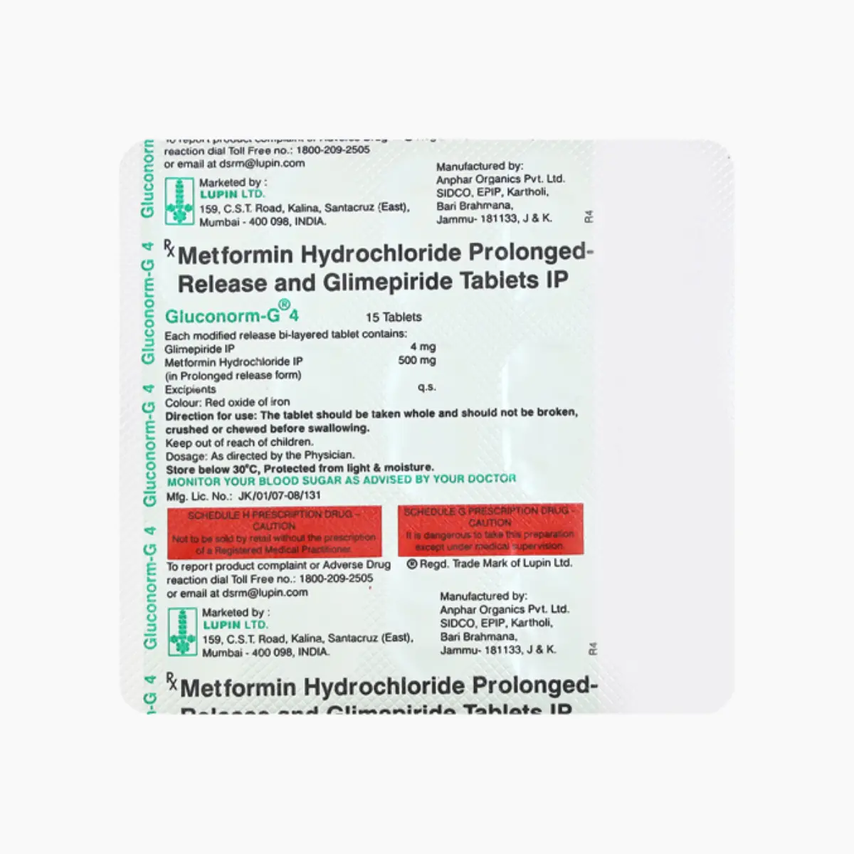 Gluconorm-G 4 Tablet is categorized as an anti-diabetic medication, combining two active ingredients to manage type 2 diabetes mellitus in adult patients. This medication plays a crucial role in regulating blood glucose levels in individuals diagnosed with diabetes. To maximize its effectiveness, it is recommended to take Gluconorm-G 4 with meals and maintain a consistent daily routine regarding the timing of doses. The prescribing physician will determine the appropriate dosage based on individual blood sugar levels and may adjust it as necessary over time. It is vital to continue taking this medication, even if you feel well or your blood glucose appears stable, as discontinuing it without medical guidance could lead to elevated blood sugar levels. This, in turn, can result in serious complications such as kidney damage, vision loss, nerve dysfunction, and possibly amputation of limbs. It is essential to understand that medication is only one part of a comprehensive treatment plan that should also incorporate a balanced diet, regular physical activity, and weight management as instructed by a healthcare provider. Lifestyle choices significantly influence diabetes control. One of the most frequently encountered adverse effects is hypoglycemia, characterized by low blood sugar levels. Therefore, awareness of symptoms indicative of hypoglycemia—such as sweating, dizziness, headaches, and trembling—is vital, along with knowing how to manage these occurrences effectively. Regular meal consumption and carrying quick sources of glucose, like sugary snacks or juice, is critical to reducing the risk of hypoglycemia. Alcohol consumption should be avoided since it may further lower blood sugar levels. Other potential side effects include changes in taste, nausea, diarrhea, abdominal discomfort, headaches, and respiratory infections, along with possible weight gain. Individuals with type 1 diabetes, diabetic ketoacidosis, or severe liver or kidney diseases should not take Gluconorm-G 4. Prior to usage, patients should inform their doctor about any history of heart disease, and both pregnant and breastfeeding individuals should seek medical advice before starting the treatment. Regular monitoring of blood sugar, blood cell counts, and liver function is also necessary during therapy.