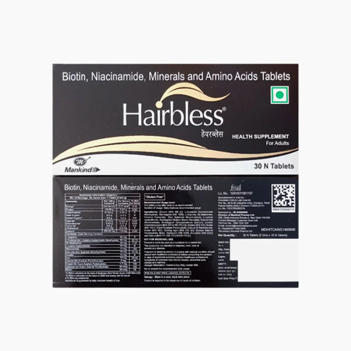 Hairbless Tablet is designed as a dietary supplement aimed at enhancing hair health and promoting growth. It operates on a cellular level to support the development of healthier hair. The formulation is enriched with a variety of vitamins, amino acids, and minerals essential for maintaining hair vitality. B-complex vitamins play a crucial role in hair development and in fortifying hair strands. The blend of nutrients within the tablet invigorates the regeneration of hair follicles, helps to mitigate hair greying and loss, and aids in the balance of sebum production. The key components include L-Arginine, L-Cysteine, DL-Methionine, L-Lysine, Niacinamide, Zinc, Inositol, Iron, Calcium Pantothenate, Copper, Selenium, and Biotin, along with various excipients. These ingredients collaborate to nourish the hair from within, potentially leading to thicker, stronger hair while also enhancing its sheen and volume. The product is also beneficial for improving blood circulation to the scalp, thereby ensuring that hair follicles receive adequate nutrients. Additionally, it assists in preventing dryness and frizz, contributing to overall hair manageability. Notably, the Hairbless Tablet does not contain any added sugar, making it a favorable option for many users. A deficiency in the essential nutrients provided by such supplements can lead to issues such as increased hair fall and hair thinning.
