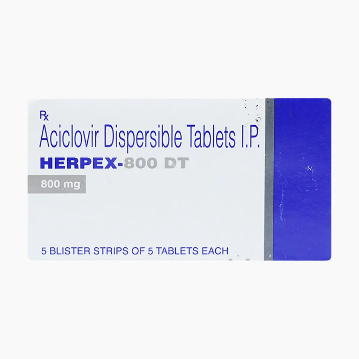 Herpex 800 Tablet functions as an antiviral medication aimed at managing various viral infections such as herpes simplex, shingles, chickenpox, and genital herpes. This medication works by inhibiting the replication of viruses within human cells, thereby aiding in the resolution of infections. It is essential to follow your healthcare provider’s instructions regarding the dosage and duration of treatment with Herpex 800. Consistency is key; do not skip doses and complete the entire treatment regimen even if you start to feel better beforehand. For optimal results, dissolve the tablet in a glass of water prior to ingestion. It may be taken with or without food, though establishing a regular schedule for dosing is recommended. In the event that you miss a dose, take it as soon as you remember, unless it is close to the time of your next scheduled dose, in which case, skip the missed dose and continue with your regular medication routine—do not take a double dose. Staying well-hydrated during treatment is vital, as it helps to avoid dehydration and potential kidney issues. Should any side effects persist or worsen, it is important to contact your healthcare provider. Pregnant or breastfeeding individuals should seek medical advice before starting this medication.
