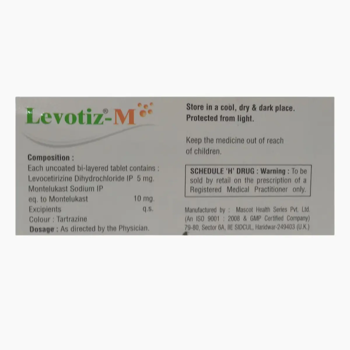 Levotiz-M Tablet is a composite medication designed for alleviating symptoms associated with allergies. These symptoms may include a runny or blocked nose, sneezing, itching, swelling, watery eyes, and nasal congestion. Additionally, this medicine works to diminish inflammation within the respiratory passages, thereby facilitating easier breathing. The tablet can be consumed regardless of meal times, following the dosage and duration specified by your physician. The prescribed dosage will be tailored to your specific health condition and your response to the treatment. It is crucial to continue using this medication for the entire period recommended by your healthcare provider. Halting treatment prematurely may lead to a resurgence of symptoms, potentially worsening the underlying condition. Make sure your healthcare team is informed about any other medications you are currently taking, as interactions may occur that could influence the effectiveness or safety of Levotiz-M. While side effects are generally mild and temporary, including nausea, diarrhea, and fatigue, monitoring your health during treatment is important. If you have any concerns regarding side effects, reach out to your doctor promptly. This medication can result in drowsiness or dizziness; therefore, it is advisable to refrain from driving or engaging in activities that require full concentration until you understand how it impacts you. Ensure adequate fluid intake while undergoing treatment, and if you have any history of kidney issues, inform your doctor before initiating this medication.