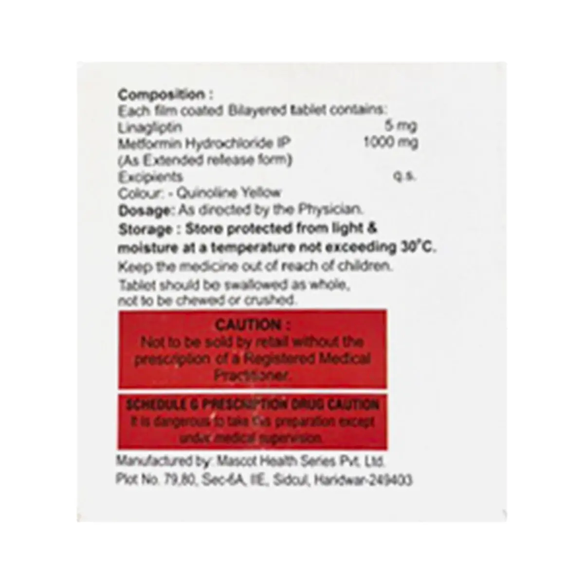 Linanext M 1000mg/5mg Extended Release Tablet is a therapeutic formulation that combines two active ingredients aimed at managing elevated blood glucose levels in individuals diagnosed with type 2 diabetes mellitus. This medication functions by enhancing the body’s response to insulin and decreasing hepatic glucose production. It may be prescribed as a standalone treatment or in conjunction with other antidiabetic agents. Optimal effectiveness is typically achieved when Linanext M is used alongside a balanced diet and consistent physical activity. The specific dosage is tailored to the individual’s medical condition, current blood sugar readings, and concurrent medications. To reduce the likelihood of gastrointestinal discomfort, it is advisable to take this medication with food. Patients should adhere strictly to their healthcare provider’s instructions regarding dosage. Regular monitoring and adherence to a prescribed diet and exercise regimen are crucial components in the management of diabetes. Avoid altering the dose or discontinuing use without professional guidance. While on this medication, it is important to discuss any potential side effects with your healthcare provider. Some commonly reported adverse effects include headaches, nausea, dizziness, and skin rashes. Additionally, there is a risk of experiencing hypoglycemia, particularly if Linanext M is combined with other diabetes medications such as insulin or sulfonylureas. Individuals with a medical history of kidney, liver, heart disease, or pancreatic disorders should inform their doctor prior to starting treatment. Pregnant or lactating women are advised to seek medical advice before using this medication. Alcohol consumption should be avoided as it may lead to decreased blood sugar levels. Regular evaluations of kidney function and blood glucose levels will be conducted by your healthcare provider throughout the treatment course. Linanext M 1000mg/5mg Extended Release Tablet is not indicated for the treatment of type 1 diabetes.