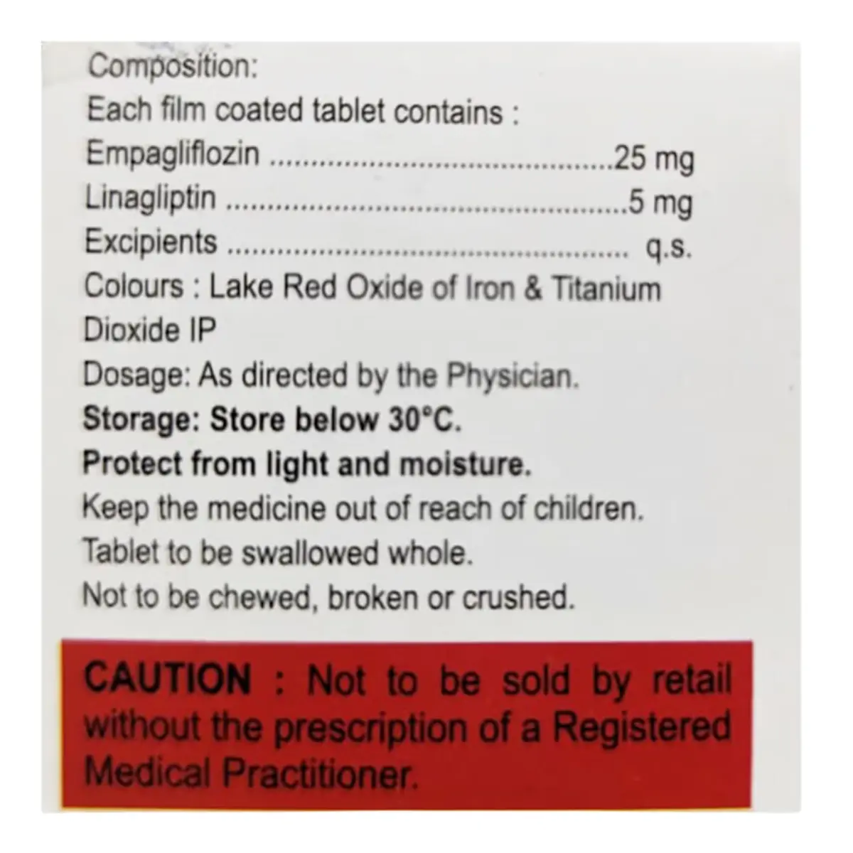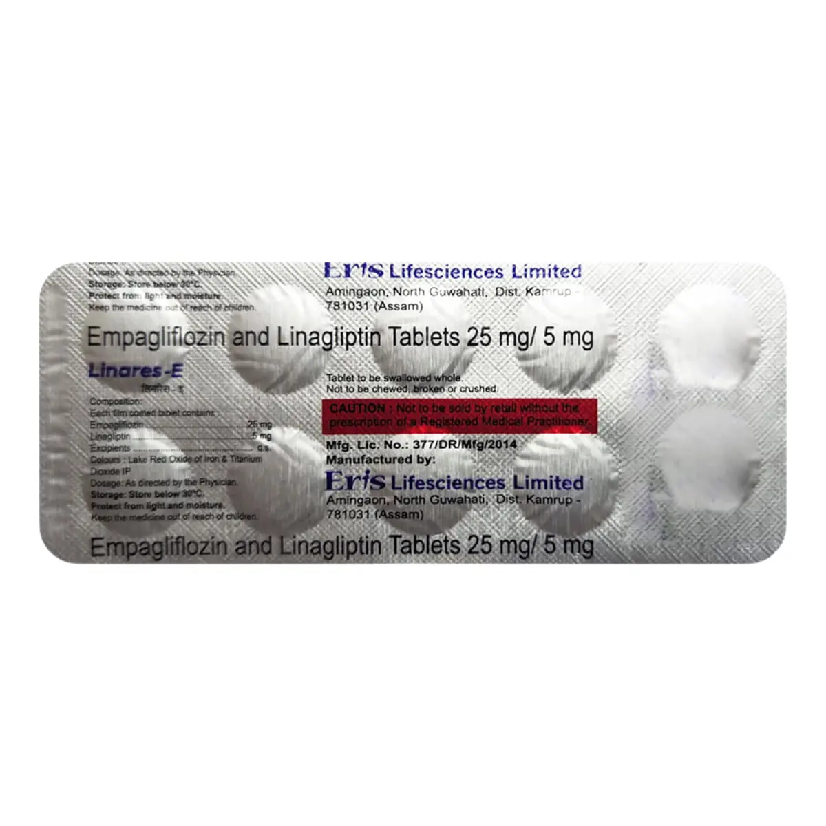 Linares-E Tablet is a composite medication designed to assist in regulating blood glucose levels. It is intended for use alongside dietary modifications and physical activity to enhance glycemic control in individuals diagnosed with type 2 diabetes mellitus. This formulation aids the body in effectively utilizing insulin, which contributes to the reduction of blood sugar levels. Administration of Linares-E Tablet can occur at any time, with or without meals, although it is advisable to consistently take it at the same time each day for optimal results. The prescribing physician will determine the appropriate dosage, and it is crucial not to discontinue the medication without consulting a healthcare professional, as this may lead to an increase in blood sugar, potentially resulting in severe complications such as renal impairment and vision loss. This medication is part of a comprehensive management strategy that should also encompass a nutritious diet, consistent exercise, and weight management as directed by a healthcare provider. The most frequently reported side effects associated with this medication include urinary tract infections, nasopharyngitis, and upper respiratory infections. To mitigate the risk of dehydration, it is beneficial to stay well-hydrated while on this medication. Additionally, some individuals may experience fungal infections in the genital region, which can be minimized by practicing good hygiene. Prior to initiation of this medication, it is essential to inform your healthcare provider about any existing kidney or liver issues, urinary tract infections, or concurrent use of diuretics. Pregnant or nursing individuals should seek medical advice before starting this treatment. It is also important to limit alcohol consumption during this treatment, as it may elevate the risk of side effects. Regularly monitoring blood sugar levels is advised during the course of this medication.