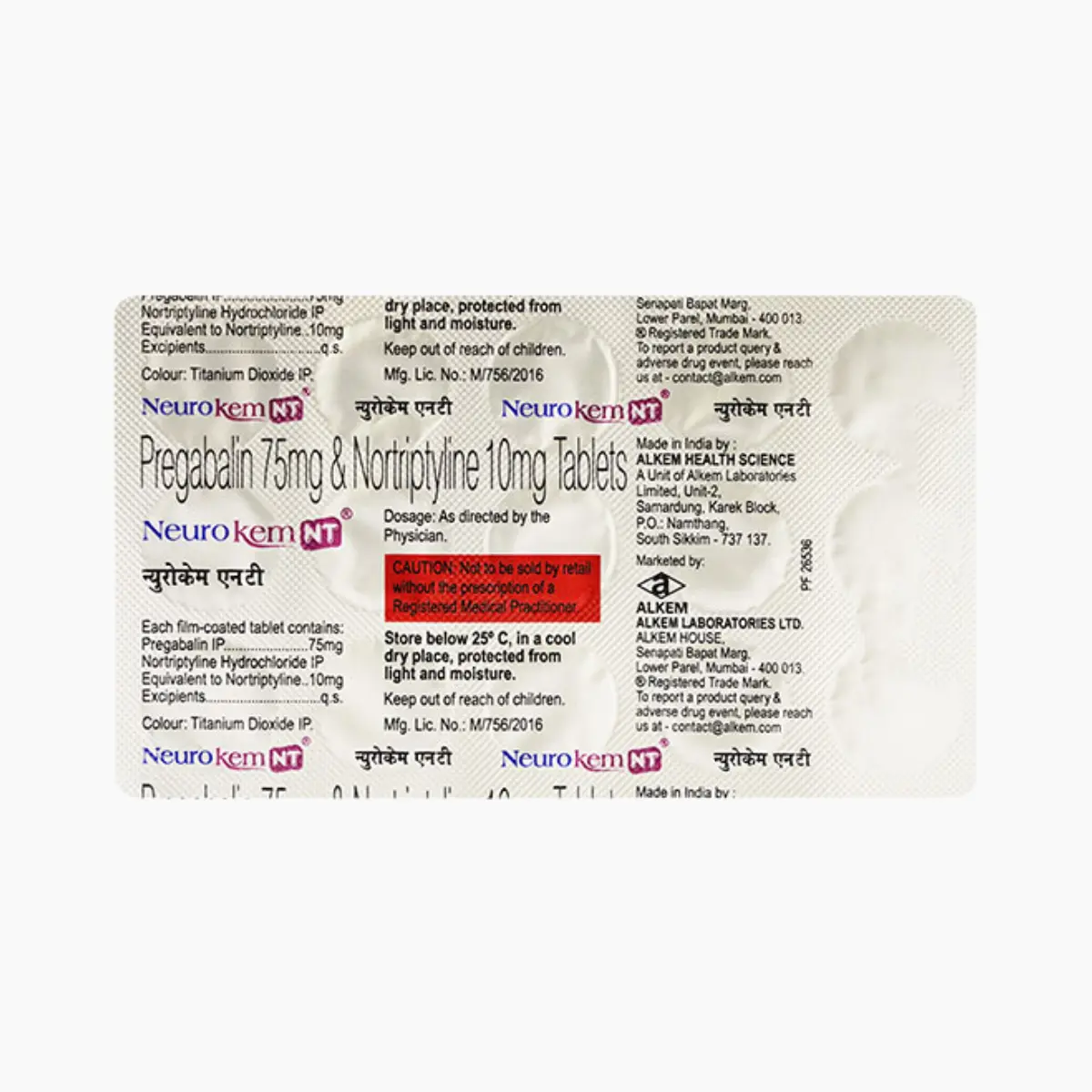Neurokem NT Tablet is formulated as a combination therapy intended for the management of neuropathic pain. This medication works by inhibiting the transmission of pain signals to the brain, thereby alleviating discomfort. It can be administered with or without meals, though it is advisable to take it before bedtime for optimal results. Consistency in dosage timing is important to maintain stable blood levels of the medication. It is crucial to adhere to the prescribed dosage and duration provided by your healthcare professional. Should you forget to take a dose, it is recommended to do so as soon as you remember, but skip it if it’s almost time for your next scheduled dose. Completing the entire treatment course is essential, even if symptoms improve, and discontinuation should only occur under medical supervision to avoid withdrawal effects. Users should be aware that some frequent side effects may include constipation, nausea, visual disturbances, and increased sweating. Other possible reactions include dizziness and drowsiness, which may impair activities requiring full concentration, such as driving. Monitoring for weight gain is recommended, and maintaining regular exercise and a healthy diet can help manage this side effect. It is important to notify your healthcare provider about any significant mood changes, worsening depression, or thoughts of self-harm during treatment. Prior to starting Neurokem NT Tablet, it is important that individuals with kidney or liver conditions inform their doctor. Additionally, a complete list of current medications should be shared, as interactions may alter the efficacy or safety of this treatment. If you are pregnant, planning to conceive, or breastfeeding, consult your healthcare provider for advice tailored to your situation.