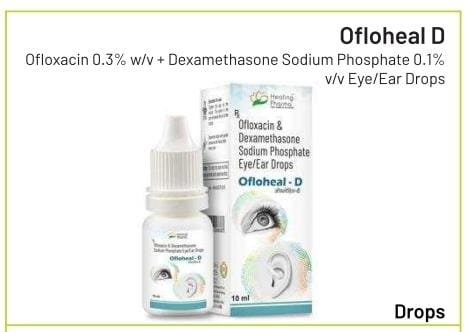 Ofloheal D [Ofloxacin 0.3% w/v + Dexamethasone Sodium Phosphate 0.1% v/v Eye/Ear Drops] This medication is used to treat infections of the eyes and ears, combining an antibiotic with a corticosteroid to reduce inflammation and combat infection