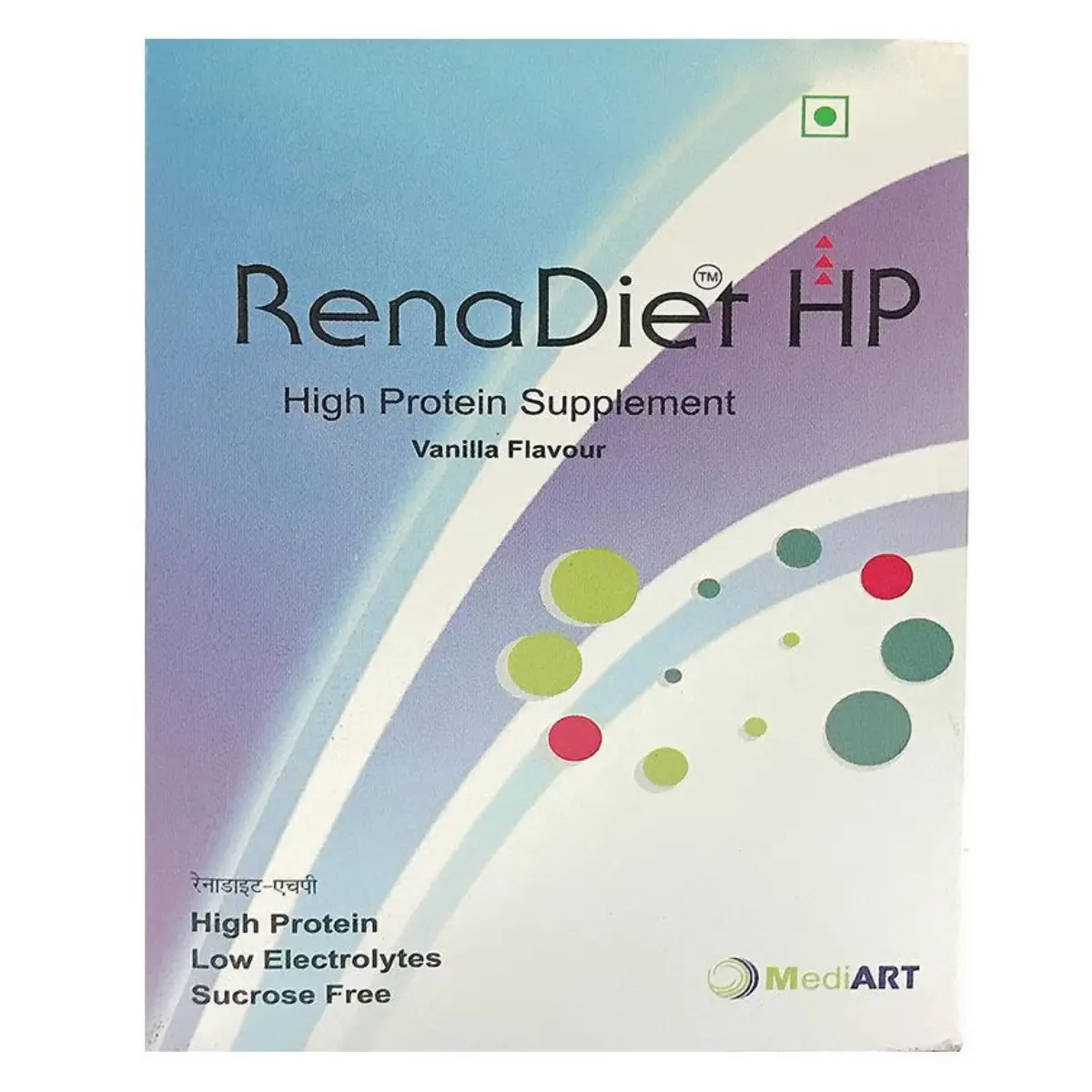 Renadiet HP Sachet is a specialized high-protein powder formulated specifically for individuals undergoing dialysis. This nutritional supplement is crafted to assist in replenishing the protein that may be depleted during the dialysis process. Each sachet contains a comprehensive blend of vital ingredients, including proteins and a variety of essential vitamins and minerals such as calcium, potassium, phosphorus, sodium, and various B vitamins. The presence of vitamin C, magnesium, and several amino acids further enhances its nutritional profile. Additionally, the product includes whey protein concentrate, maltodextrin, skimmed milk powder, and sucralose to support its formulation. This nutritional aid contributes to the maintenance and repair of muscle and other tissues that can be affected by dialysis treatment. The inclusion of numerous vitamins and minerals plays a crucial role in supporting overall bodily functions and may significantly enhance the immune response, which is particularly beneficial for those undergoing dialysis. The vanilla flavor not only serves to diversify the dietary options for patients but also makes the consumption experience more pleasant, especially for individuals whose taste sensations may be altered due to their treatment. Overall, Renadiet HP Sachet aims to provide a comprehensive nutritional solution that supports health and well-being in dialysis patients. Use this medicine only under medical supervision. Follow the dose and schedule exactly as advised. Do not stop abruptly without guidance. Keep a record of any unusual symptoms and share them with your clinician. Combine therapy with appropriate lifestyle measures and routine monitoring as recommended.