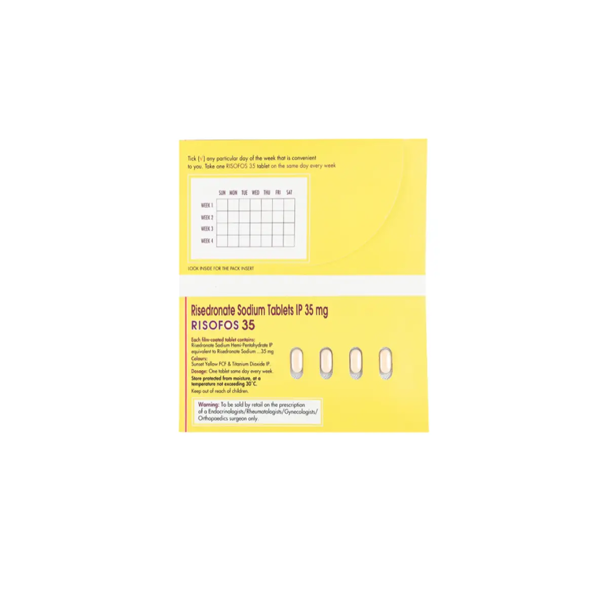 Risofos 35 Tablet is indicated for the treatment and prevention of osteoporosis, a condition characterized by the weakening of bones, which may occur due to menopause or long-term steroid use. By taking this medication, you can lower the likelihood of experiencing bone fractures. It is recommended to take Risofos 35 Tablet on an empty stomach for optimal absorption. Adhering to a consistent dosing schedule, as instructed by your healthcare provider, is essential. Taking the medication at the same time daily can assist in maintaining this routine. It is important to complete the full course of treatment, even if symptoms improve before that time, as the full therapeutic effects may not be evident for several days. Risofos 35 Tablet should be part of a comprehensive treatment plan, which may include dietary adjustments, as well as the intake of calcium and vitamin supplements. Potential side effects are mainly mild and can include headaches, pain in bones, muscles, or joints, indigestion, heartburn, and diarrhea. These effects typically fade over time, but if they persist, consulting your healthcare provider is advisable. Serious adverse reactions may include kidney issues, especially in individuals who are dehydrated or have pre-existing kidney conditions, as well as hypocalcemia and discomfort in the mouth or jaw. Such symptoms warrant immediate medical attention. Patients should inform their doctor of any kidney problems or low calcium levels prior to starting treatment. It is also crucial to disclose all other medications being taken, as there may be interactions with drugs used for serious infections, cancer, or osteoporosis. Routine monitoring of kidney function and mineral levels might be necessary. Additionally, it is advisable to avoid smoking, as it can negatively impact bone density. Excessive alcohol consumption should also be limited, as it can contribute to bone loss.