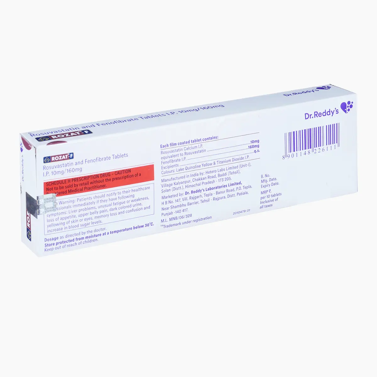 Rozat-F Tablet is a formulation consisting of two types of medications that help reduce lipid levels in the blood, specifically targeting cholesterol and triglycerides. It is utilized when dietary modifications alone, such as adhering to a low-fat diet, have not successfully lowered these lipid levels. The aim of this medication is to decrease the risk of developing cardiovascular diseases. Patients can take Rozat-F Tablet either with food or on an empty stomach, and it is recommended to take the tablet at the same time each day to maintain a routine. The dosage is individualized based on the patient’s lipid levels and their response to treatment. Even though individuals with elevated cholesterol and triglyceride levels may not exhibit any symptoms, discontinuation of the medication can lead to an increase in lipid levels, which poses a greater risk of heart disease and stroke. Regular monitoring of cholesterol and triglyceride levels is essential. This medication is part of a broader management strategy that should also emphasize a balanced diet low in fat, consistent physical activity, smoking cessation, limited alcohol consumption, and weight management. While using this medication, patients can maintain a normal diet but should avoid high-fat foods. Mild side effects may include nausea, abdominal discomfort, constipation, headaches, excessive gas, and muscle aches, which typically resolve quickly. Patients should consult their physician if side effects persist or if they experience yellowing of the eyes, unusual bleeding, or severe, unexplained muscle pains. Periodic liver function testing may be recommended during treatment. Rozat-F Tablet is contraindicated in individuals with liver disorders. Patients should inform their healthcare provider of any kidney issues or if they are pregnant, planning to conceive, or breastfeeding since diabetic patients may see an increase in blood sugar levels while on this treatment.