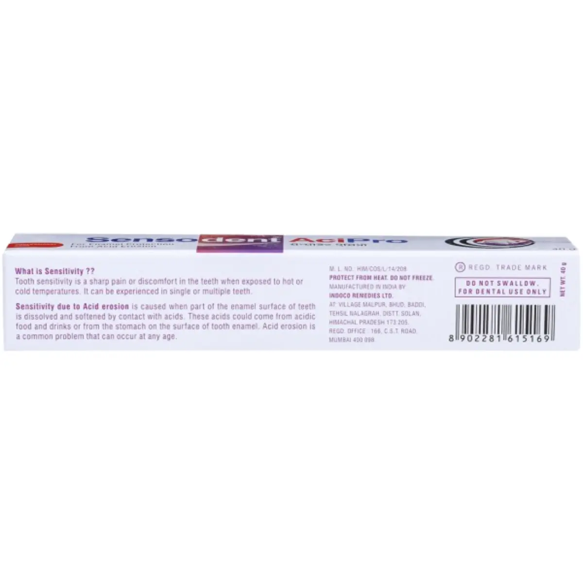 Sensodent AciPro is a specialized dental gel designed to foam and provide protection for teeth affected by sensitivity linked to acid erosion. This formulation does not contain fluoride, making it suitable for individuals who prefer or require a non-fluoridated option. The gel is intended for professional use and aims to support enamel health by creating a barrier against harmful substances that can exacerbate sensitivity. By utilizing this product, users may experience a reduction in discomfort caused by exposure to acidic foods and beverages. Sensodent AciPro is formulated with safety and efficacy in mind, helping to maintain optimal dental hygiene while addressing specific concerns related to tooth sensitivity. Regular use as directed can contribute to a healthier mouth environment and aid in the prevention of potential issues related to enamel wear. Given its professional care status, it is advisable for individuals to consult with their dental care provider to determine the best usage practices for their unique dental health needs. Use this medicine only under medical supervision. Follow the dose and schedule exactly as advised. Do not stop abruptly without guidance. Keep a record of any unusual symptoms and share them with your clinician. Combine therapy with appropriate lifestyle measures and routine monitoring as recommended.