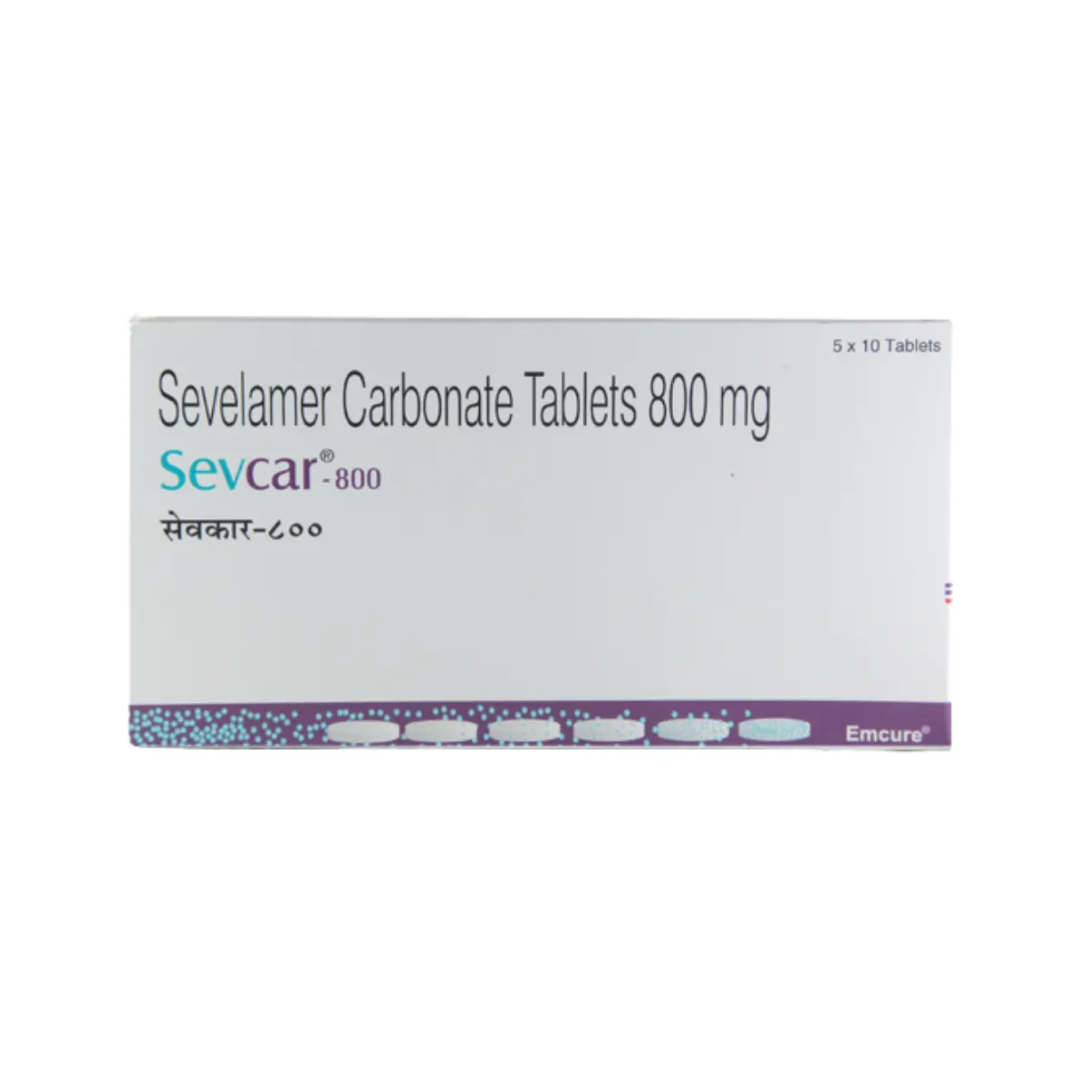 Sevcar 800 Tablet is indicated for managing elevated phosphate concentrations in the bloodstream, particularly in individuals undergoing dialysis due to severe kidney impairment. This medication functions by decreasing the intestinal absorption of phosphate, thereby aiding in the reduction of phosphate levels in the bloodstream. It is important to take Sevcar 800 Tablet alongside food to enhance its effectiveness. Adhere to the dosage and duration prescribed by your healthcare provider, and make it a habit to take the medication consistently at the same time each day to achieve optimal results. While using Sevcar 800 Tablet, some patients may experience side effects, including nausea, abdominal discomfort, constipation, diarrhea, and vomiting. Additionally, there may be instances of reduced levels of calcium, folic acid, and fat-soluble vitamins A, D, E, and K in the blood. If you encounter any of these side effects, or if you have concerns regarding them, please follow your doctor’s advice regarding potential supplementation. Use this medicine only under medical supervision. Follow the dose and schedule exactly as advised. Do not stop abruptly without guidance. Keep a record of any unusual symptoms and share them with your clinician. Combine therapy with appropriate lifestyle measures and routine monitoring as recommended. Use this medicine only under medical supervision. Follow the dose and schedule exactly as advised. Do not stop abruptly without guidance. Keep a record of any unusual symptoms and share them with your clinician. Combine therapy with appropriate lifestyle measures and routine monitoring as recommended.