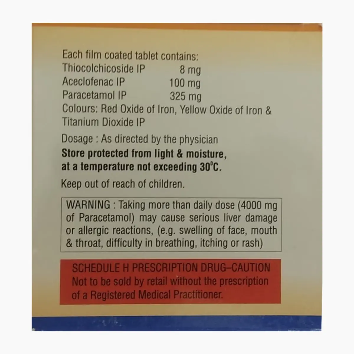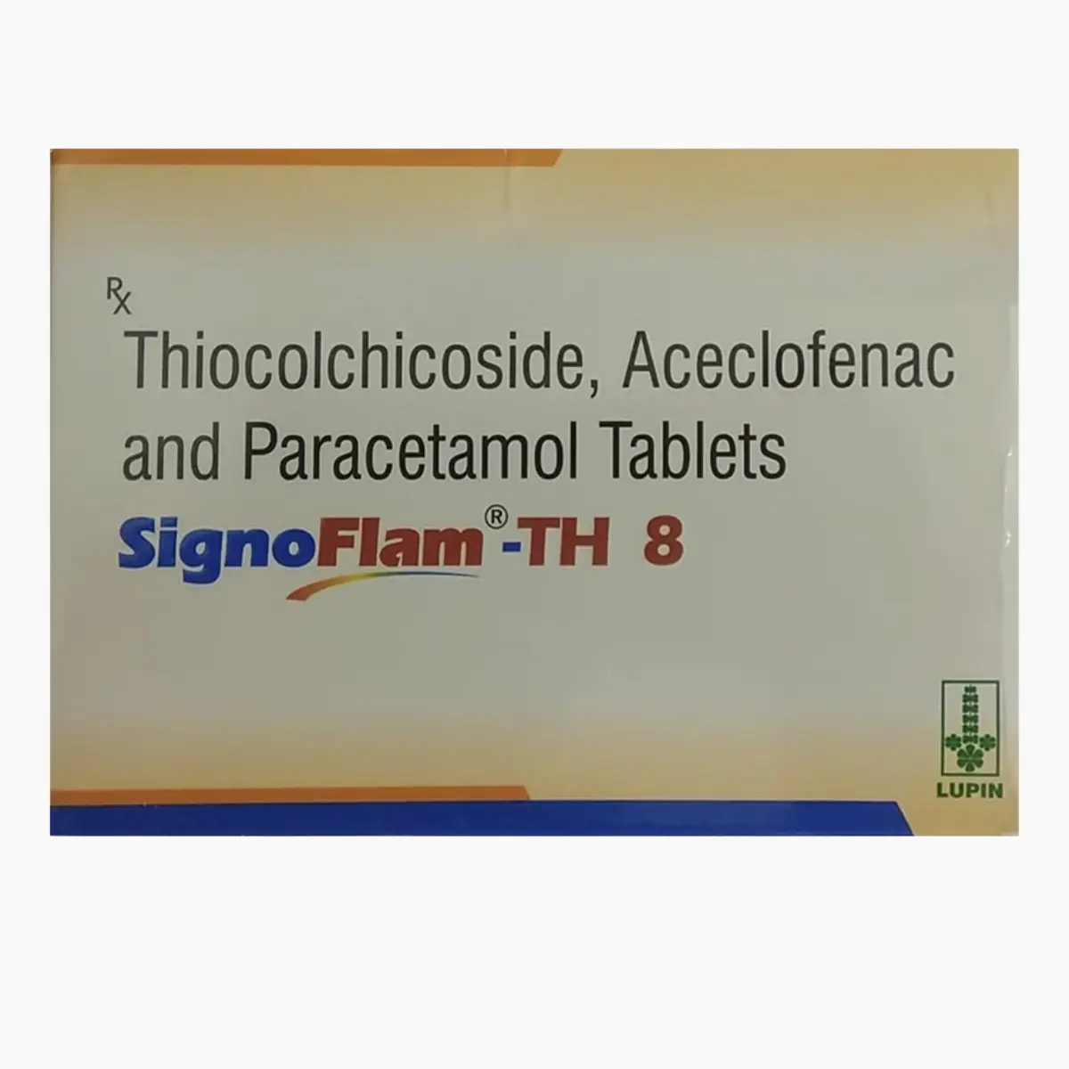 Signoflam-TH 8 Tablet is a medicine specifically designed to alleviate muscle pain. Its mechanism of action involves inhibiting the production of specific chemical signals responsible for inducing pain, inflammation, and fever. By doing so, it enhances muscle movement and provides significant relief from discomfort and pain. It is recommended to take Signoflam-TH 8 Tablet with food to minimize the risk of experiencing gastrointestinal upset. The appropriate dosage and treatment duration will be determined by the severity of your symptoms. It is important to continue taking the medication as prescribed by your healthcare provider, even if you start to feel better, until advised otherwise. While using this medication, you may encounter some common side effects that could include nausea, vomiting, heartburn, abdominal pain, diarrhea, decreased appetite, and dry mouth. Should these symptoms persist or worsen, it is essential to inform your healthcare provider, who may offer strategies to mitigate these effects. Generally, utilizing the lowest effective dose is encouraged to manage your symptoms effectively. Before initiating treatment, it is crucial to discuss any pre-existing medical conditions with your doctor and inform them about all medications you are currently taking. Additionally, disclosing any liver or kidney issues is necessary to ensure the safe use of this medicine. Alcohol consumption is discouraged during treatment with this medication. Pregnant or breastfeeding individuals should seek medical advice before starting this medication.