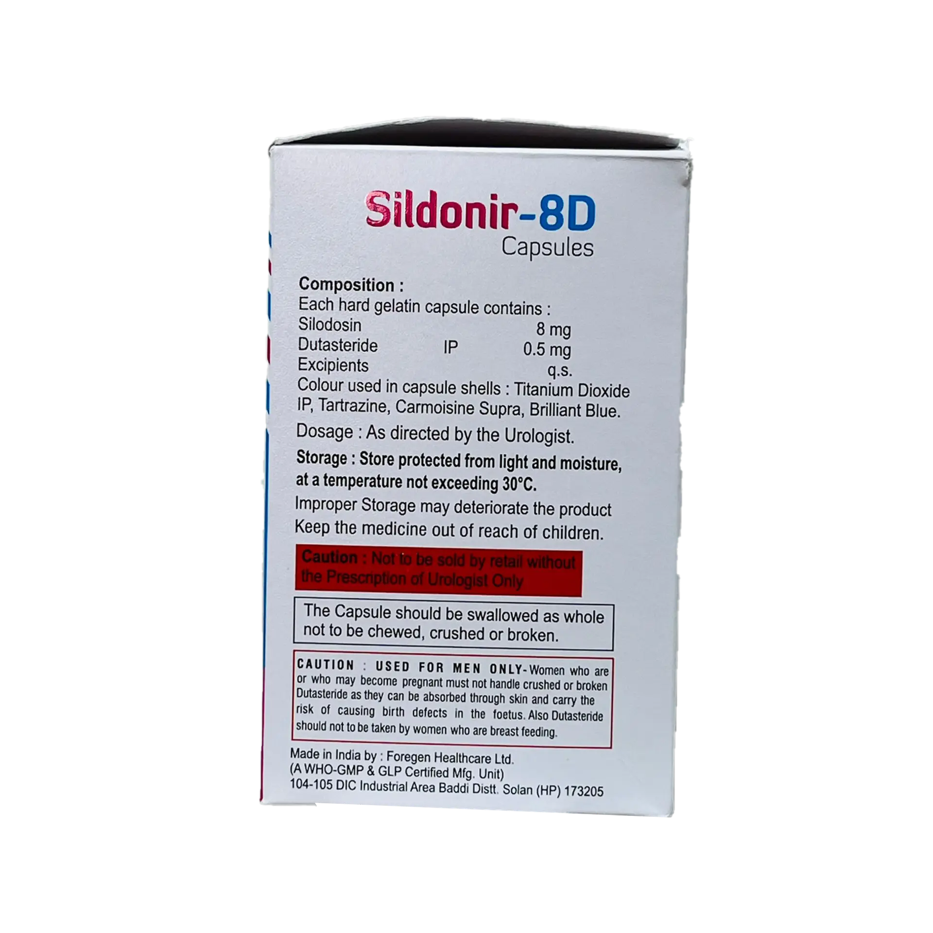 Sildonir-8D capsules are formulated as a blend of two medications that operate through distinct mechanisms to assist men suffering from an enlarged prostate. This treatment aims to alleviate symptoms such as challenges with urination and the increased frequency of urination. It is important to note that this medication is not intended to serve as a preventive measure against prostate cancer. Users are advised to take the capsules consistently at the same time daily and must swallow them whole, without chewing, breaking, or crushing. The prescribing physician will determine the most appropriate dosage for the individual. To achieve optimal results and effectively manage symptoms, patients should adhere to the dosage schedule, even if they feel improvements. It may take up to four weeks to observe noticeable improvements; thus, it is crucial to continue taking the medication regularly. If symptoms show no sign of improvement or worsen after four weeks, it is important to consult the prescribing physician. Commonly reported side effects may include reduced sexual desire, difficulty achieving an erection, tenderness in the breast area, and breast enlargement. Should these side effects cause concern or persist, it is advisable to reach out to the healthcare provider. Dizziness and drowsiness may also occur, particularly when initiating treatment. It is essential to understand that the prescribing doctor has deemed the benefits of this medication to outweigh the associated risks. This medication is not suitable for women or children. Prior to beginning treatment, patients should inform their doctor of any history of low blood pressure or pre-existing liver or kidney conditions, as it may not be appropriate for them. Additionally, interactions with other medications are possible, so providing a complete list of current medications to the healthcare provider is crucial. Patients might be recommended to use condoms during sexual activity and to monitor their blood pressure regularly. Consult with your healthcare provider regarding alcohol consumption.