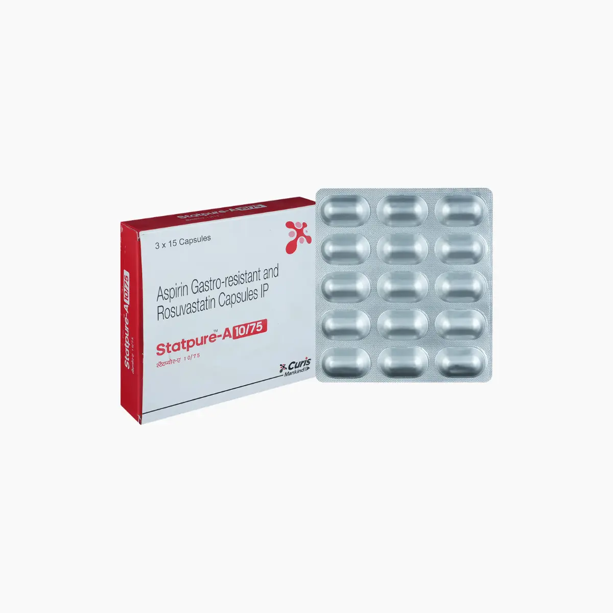 Statpure-A 10/75 Capsule is a formulation comprising two active ingredients designed to help prevent serious cardiovascular events such as heart attacks, strokes, and episodes of angina. This capsule works by lowering levels of low-density lipoprotein (LDL), often referred to as “bad” cholesterol, as well as triglycerides, which are fats found in the blood. Additionally, it aids in reducing the risk of clot formation, thereby improving overall cardiovascular health. It is advisable to take Statpure-A 10/75 Capsules alongside food to minimize the potential for stomach discomfort. Adhering to a consistent dosing schedule is crucial, and you should take the medication at evenly spaced intervals, ideally at the same time each day, to enhance compliance. The specific dosage and length of treatment are tailored to your individual health needs and medical conditions. It is essential to complete the full course of therapy, even if you start feeling better before finishing the medication. To optimize the effectiveness of the treatment, lifestyle modifications—such as following a low-fat diet, engaging in regular physical activity, and avoiding smoking—should be incorporated. Be aware that this medication may elevate the risk of bleeding; therefore, exercising caution during activities that could lead to injury, such as shaving or participating in contact sports, is prudent. Should you notice symptoms like jaundice, unexplained muscle pain, or dark-colored urine, consulting your healthcare provider is important.