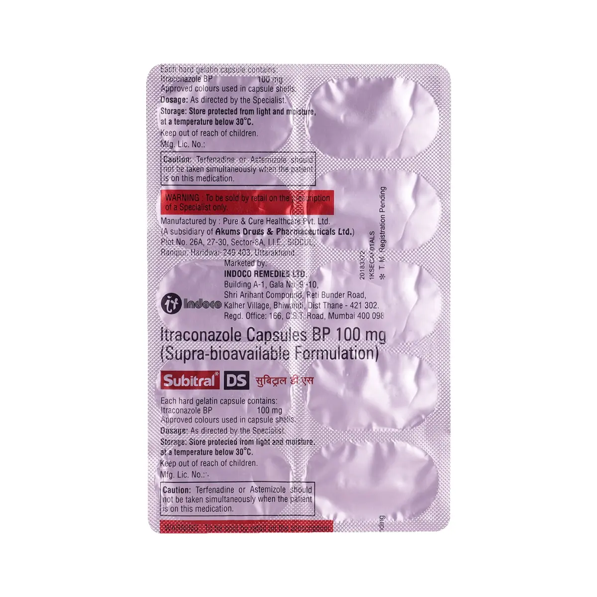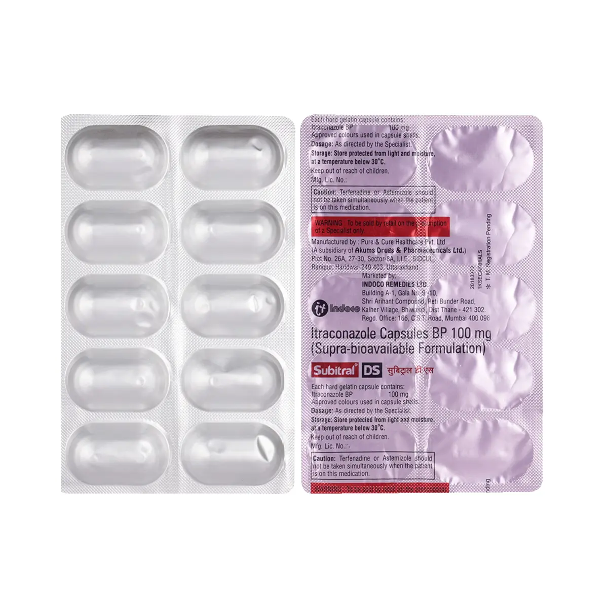 Subitral DS 100mg Capsule is classified as an antifungal medication designed to inhibit the proliferation of fungi. It is effective for treating infections located in various areas, such as the oral cavity, throat, vaginal region, and on the skin, including fingernails and toenails. The active ingredient acts by disrupting the integrity of the fungal cell membrane, leading to the death of the fungi responsible for the infection. It is crucial to adhere to the dosage and duration prescribed by your healthcare provider. The capsule should be ingested whole and may be taken with food to enhance tolerance. For optimal effectiveness, it is advised to administer the medication at consistent intervals and to complete the entire course, even if symptoms improve before the treatment is finished. Premature discontinuation may result in a resurgence of the infection, and skipping doses can elevate the risk of developing resistant fungal strains. Should symptoms persist or worsen, it is imperative to inform your healthcare provider. While this medication is generally well-tolerated, potential side effects may include nausea, dizziness, headaches, vomiting, diarrhea, stomach pain, constipation, and indigestion. If you experience severe allergic reactions, such as a significant rash, difficulties in breathing, or swelling of the face, lips, tongue, or throat, immediate medical assistance is necessary. It is essential to discuss any pre-existing health conditions with your doctor, such as heart failure or compromised immune function, as well as any kidney or liver issues, particularly jaundice, as these factors could affect the suitability of Subitral for your treatment.