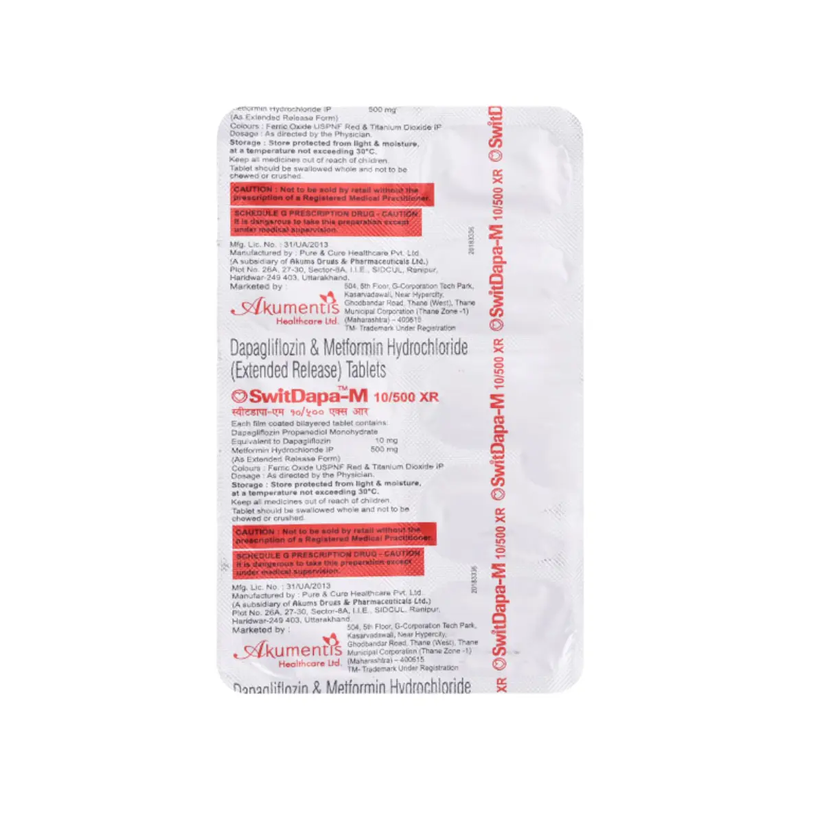 Switdapa-M 10/500 XR Tablet is formulated from two active ingredients aimed at managing type 2 diabetes mellitus. This medication assists in regulating elevated blood sugar levels commonly associated with diabetes, thereby decreasing the risk of severe complications linked to the condition, including cardiovascular issues. It is recommended to take Switdapa-M 10/500 XR with food to enhance its effectiveness. Maintaining a routine by taking the tablet at the same time each day can aid in adherence to the treatment regimen. The specific dosage should be determined by your healthcare provider, and it is essential not to discontinue usage without prior consultation as this could lead to a spike in blood sugar levels and increase the risk of serious complications such as kidney impairment and vision loss. It is important to understand that this medication is part of a comprehensive management strategy that should also involve a balanced diet, consistent physical activity, and weight management as directed by a healthcare professional. Staying well-hydrated can help prevent dehydration, which may occur with the use of this medication. Some individuals might experience fungal infections in the genital area, and maintaining personal hygiene is crucial in prevention. Prior to starting this medication, discuss any existing kidney or liver issues, urinary tract infections, or use of diuretics with your doctor. Pregnant and breastfeeding individuals should seek medical advice before initiating treatment. Regular monitoring of blood sugar levels is advised while using this medication.