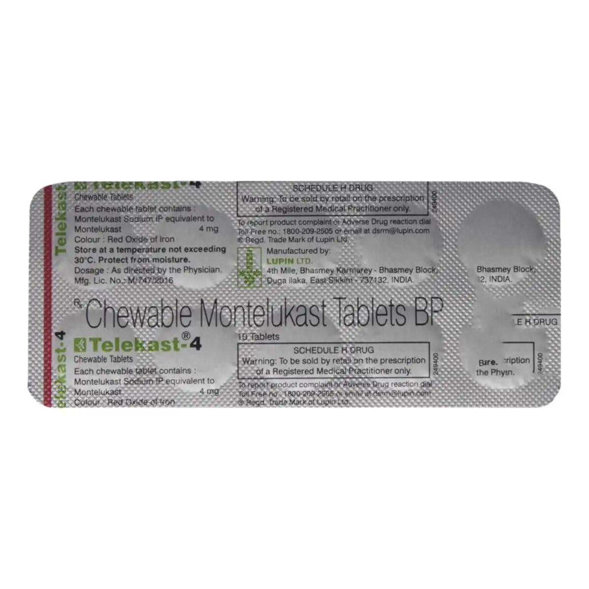 Telekast 4 Chewable Tablets are designed to help prevent asthma attacks in pediatric patients. In addition to this primary use, the tablets are also effective in alleviating breathing issues that may arise from vigorous physical activity. They can address various symptoms associated with allergic reactions, including those from seasonal changes and skin allergies. Symptoms such as a runny nose, sneezing, itching, swelling, nasal congestion, and watery eyes may be relieved with this medication. It is important to administer the Telekast 4 Chewable Tablets to your child consistently, either before or after meals, in accordance with the dosage and timing prescribed by a healthcare professional. Initial improvements in symptoms may be observed after a few doses; however, it is crucial to adhere to the full course of treatment for optimal results. Abruptly discontinuing the medication could lead to a deterioration of your child’s condition. While minor and temporary adverse effects like fever, headache, abdominal discomfort, and diarrhea may occur, these typically resolve as the child’s system adjusts to the medication. Should these side effects persist or cause significant discomfort, it is advisable to consult the child’s healthcare provider promptly. Additionally, it is essential to inform the prescribing physician about any other medications your child is currently taking and to provide a complete medical history, including previous allergic reactions, heart issues, blood disorders, vascular concerns, congenital anomalies, airway obstructions, lung issues, skin problems, and any liver or kidney dysfunction. This information is vital for properly managing your child’s treatment plan.