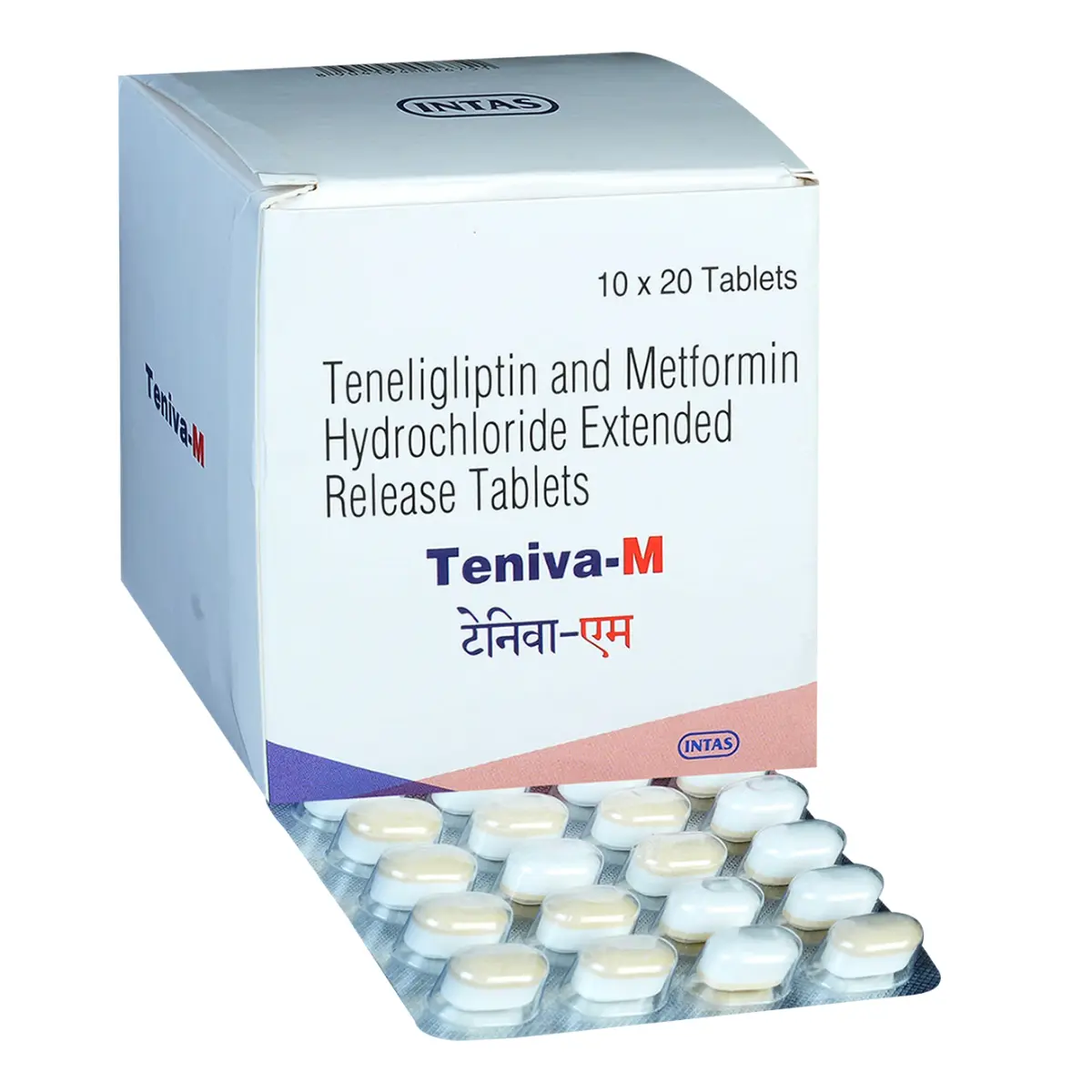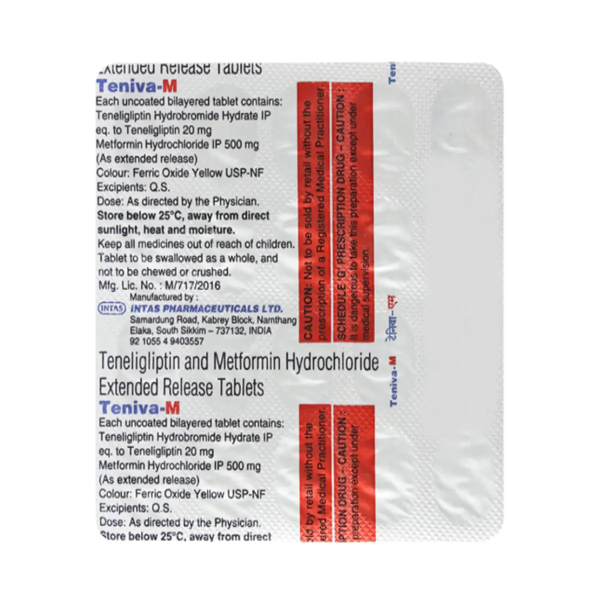 Teniva-M Tablet is formulated as a combination of two active ingredients aimed at managing elevated blood sugar levels in individuals diagnosed with type 2 diabetes mellitus. This medication plays a crucial role in mitigating the risk of severe diabetes-related complications, including kidney dysfunction and vision loss, and may also lower the likelihood of having cardiovascular incidents such as heart attacks or strokes. The administration of Teniva-M Tablet can be done either as monotherapy or in conjunction with other antidiabetic medications. To optimize its effectiveness, it is recommended that this medication be taken alongside a balanced diet and consistent physical activity, which are critical components in diabetes management. The specific dosage prescribed will be determined by factors such as your health status, blood glucose readings, and any additional medications you may be using. Taking Teniva-M Tablet with meals can help minimize gastrointestinal discomfort. Regular adherence to the medication schedule is essential for achieving the desired therapeutic outcomes, and it should only be discontinued on the advice of a healthcare professional. It is imperative to follow the dietary and exercise guidelines provided by your healthcare provider, as lifestyle choices significantly influence diabetes control. Possible adverse reactions associated with this medication include gastrointestinal disturbances and headaches. Awareness of signs of hypoglycemia is important, especially for those using other diabetes treatments like insulin or sulfonylureas. Prior to initiating treatment, it is crucial to inform your doctor of any personal or family history of kidney, liver, or heart issues, pancreatic conditions, or significant alcohol consumption. Pregnant or nursing individuals should also seek medical advice before starting this medication. Regular monitoring of kidney function and blood sugar levels is advised during treatment.