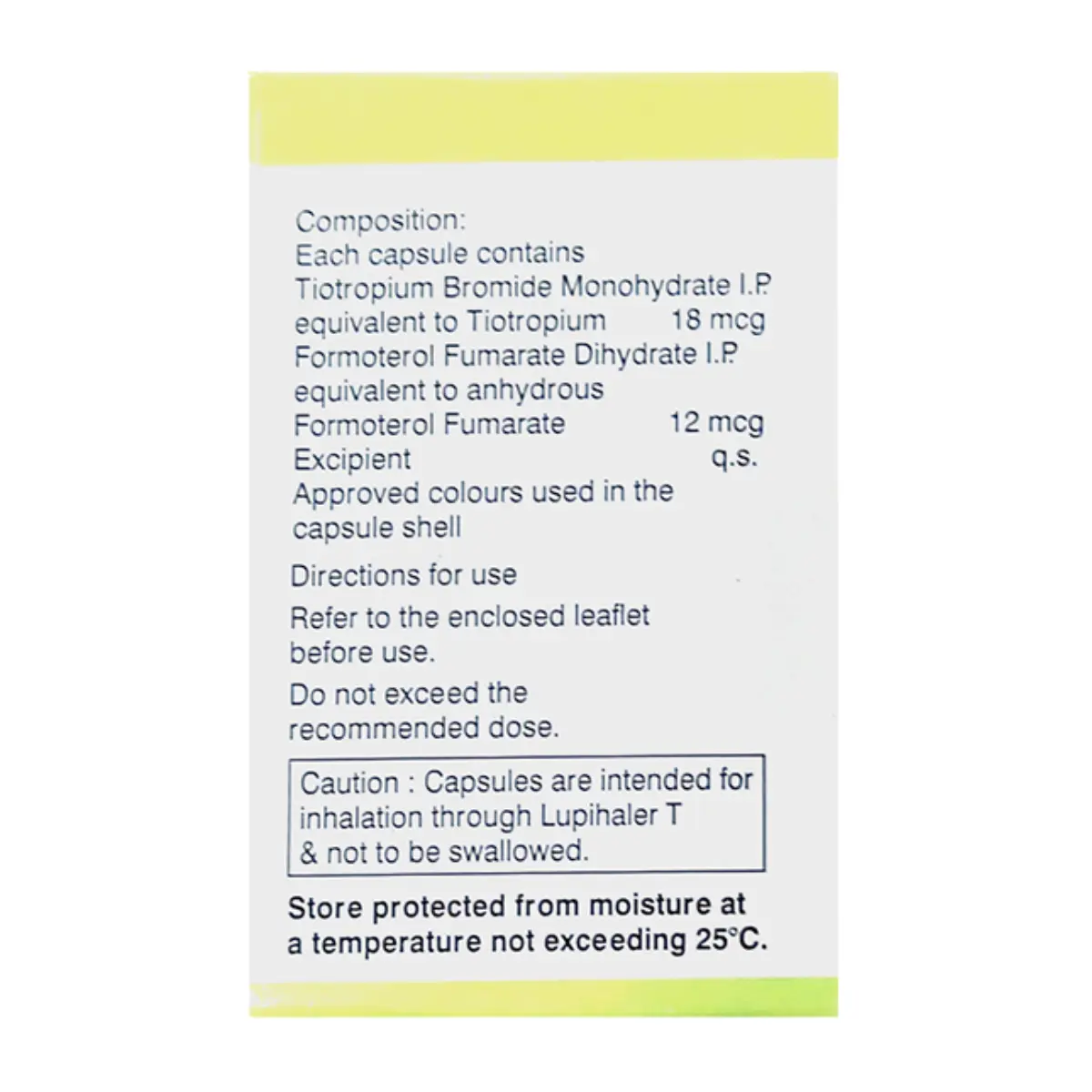 Tiomate 12mcg/18mcg Transcaps is prescribed for the management of chronic obstructive pulmonary disease (COPD), a condition characterized by restricted airflow to the lungs. The formulation aids in relaxing the smooth muscles within the airways, which facilitates easier breathing. Patients may notice some relief from symptoms such as coughing, wheezing, and breathlessness. The prescribing physician will provide guidance on the appropriate frequency of use for this medication. Initial benefits may be observed within a few days; however, optimal effectiveness typically occurs over several weeks. Consistent use is crucial for achieving the desired therapeutic effects, and it is important to continue the medication even in the absence of noticeable symptoms, as discontinuation may lead to a deterioration of COPD. To maximize the efficacy of Tiomate, proper inhalation technique is essential; incorrect usage may hinder the remedy’s effectiveness. If any additional concerns or unexpected symptoms arise during treatment, it is advisable to consult with a healthcare professional to address those issues appropriately. Use this medicine only under medical supervision. Follow the dose and schedule exactly as advised. Do not stop abruptly without guidance. Keep a record of any unusual symptoms and share them with your clinician. Combine therapy with appropriate lifestyle measures and routine monitoring as recommended.