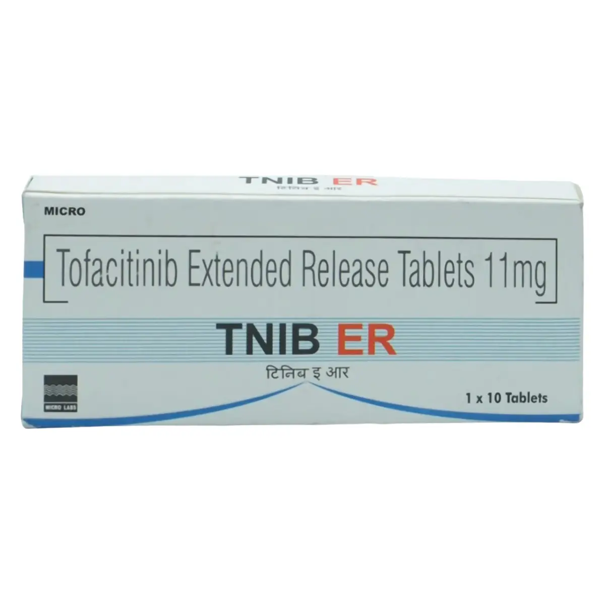 Tnib 11mg Extended Release Tablet is indicated for the management of moderate to severe cases of rheumatoid arthritis, psoriatic arthritis, ankylosing spondylitis, and ulcerative colitis. This medication assists in alleviating pain, tenderness, and swelling in the joints by mitigating inflammation. Additionally, it plays a role in decelerating the deterioration of bone and joint health. Tnib can be taken as a standalone treatment or may be combined with other medications based on your specific health needs. The tablets are versatile in that they can be administered with or without food; however, it is advisable to take them at the same time daily for optimal results. The prescribed dosage may vary based on your medical condition and any other medications you may be using. Adhere strictly to your healthcare provider’s directions, and refrain from discontinuing the medication without their guidance, as this could exacerbate your condition. Routine blood tests may be necessary prior to the initiation of therapy, and this medication should not be started if there is an existing infection. It is important to discuss any history of tuberculosis, shingles, kidney or liver impairment, hepatitis B or C, or previous blood clots with your doctor prior to commencing treatment. Tnib may increase susceptibility to infections or aggravate preexisting infections, making it essential to avoid close contact with individuals carrying contagious illnesses such as chickenpox, measles, or influenza. This medication is not intended for individuals under the age of 18, nor should it be taken during pregnancy or while breastfeeding unless deemed necessary by a healthcare professional after considering the potential risks and benefits. Regular medical evaluations may be required during your treatment period.