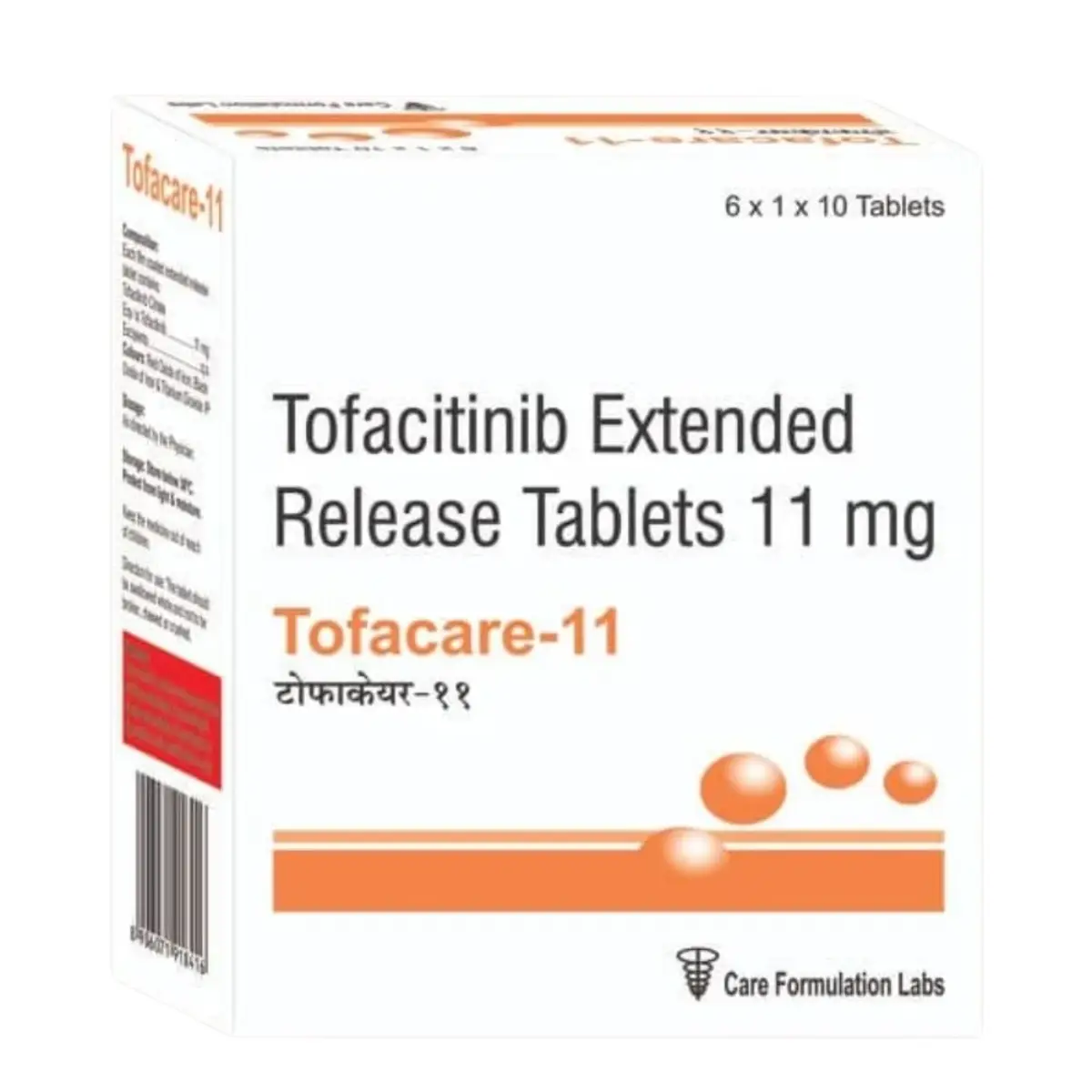Tofacare 11 mg Tablet is indicated for the management of moderate to severe rheumatoid arthritis, psoriatic arthritis, ankylosing spondylitis, and ulcerative colitis. This medication works by alleviating joint pain, tenderness, and swelling, primarily through its anti-inflammatory properties. Additionally, it may help to slow down the deterioration of bones and joints associated with these conditions. The tablet may be utilized alone or in conjunction with other treatments, depending on the prescribing physician’s assessment. It can be ingested with or without food, but it is advisable to take it consistently at the same time daily for optimal effect. The prescribed dosage will depend on the individual’s health status and concurrent medications. It is essential to follow your healthcare provider’s instructions and not to discontinue its use without medical advice, as this may exacerbate your condition. Patients may require blood tests prior to initiation of therapy, and this medication should not be started if there is any active infection present. It is crucial to inform your healthcare provider of any history of tuberculosis, shingles, or conditions affecting the kidneys or liver, among others, as Tofacare 11 mg Tablet can increase the risk of infections or worsen existing ones. This medication is not approved for individuals under the age of 18 and should only be used during pregnancy or breastfeeding if deemed necessary by your physician, who will continuously monitor your health.