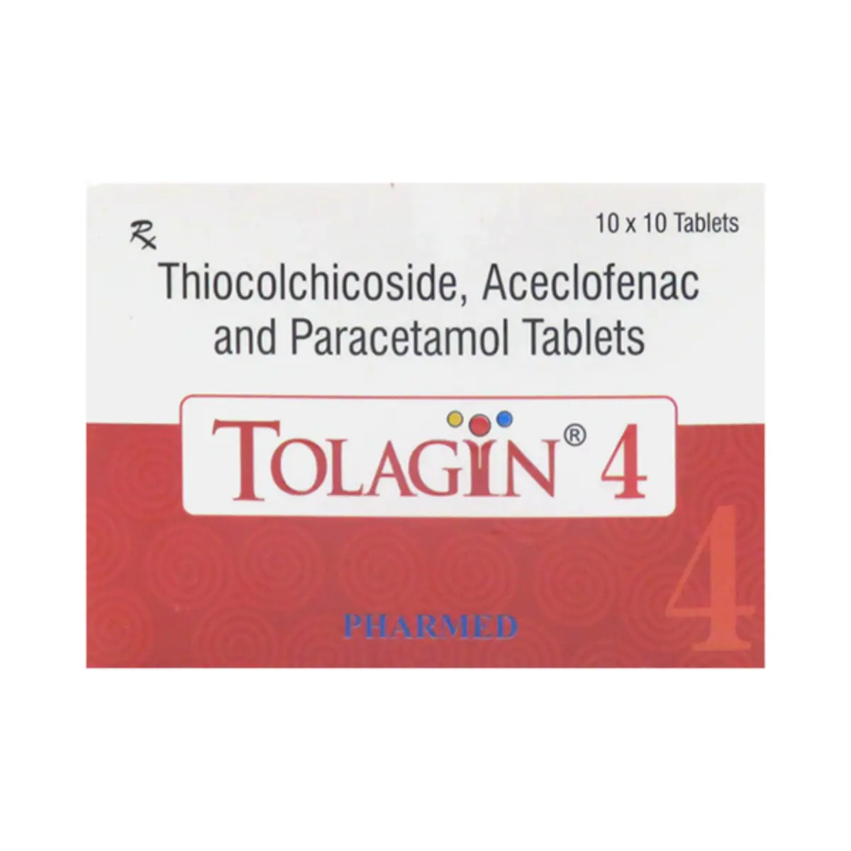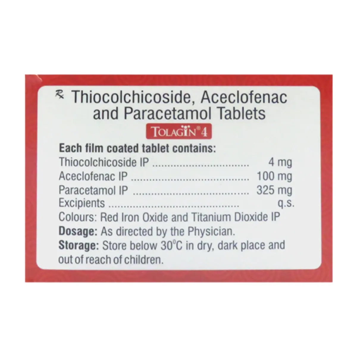 Tolagin 4 Tablet is a formulation designed to alleviate muscular discomfort. Its mechanism involves the inhibition of specific chemical signals responsible for triggering pain, inflammation, and fever. By doing so, it helps improve muscle functionality and reduces sensations of pain and unease. This medication is recommended to be taken with meals, as this can help mitigate the risk of gastrointestinal upset. The prescribed dosage and duration of the treatment will be influenced by the intensity of your symptoms. It is important to continue using the medication as directed, even if you begin to feel improvements, until your healthcare provider advises discontinuation. While using Tolagin 4 Tablet, some individuals may experience mild side effects which can include nausea, vomiting, heartburn, abdominal discomfort, diarrhea, decreased appetite, and a dry mouth sensation. Should these effects persist or worsen, it is advisable to communicate with your healthcare provider, as they may recommend strategies to alleviate these symptoms. Generally, using the lowest effective dose is recommended for symptom management. Prior to commencing treatment, it is crucial to inform your healthcare provider of any existing medical conditions and current medications, ensuring a comprehensive assessment of safety. Additionally, individuals with liver or kidney concerns should disclose this information. Alcohol consumption should be avoided during treatment. Women who are pregnant or breastfeeding are advised to seek medical guidance before use.