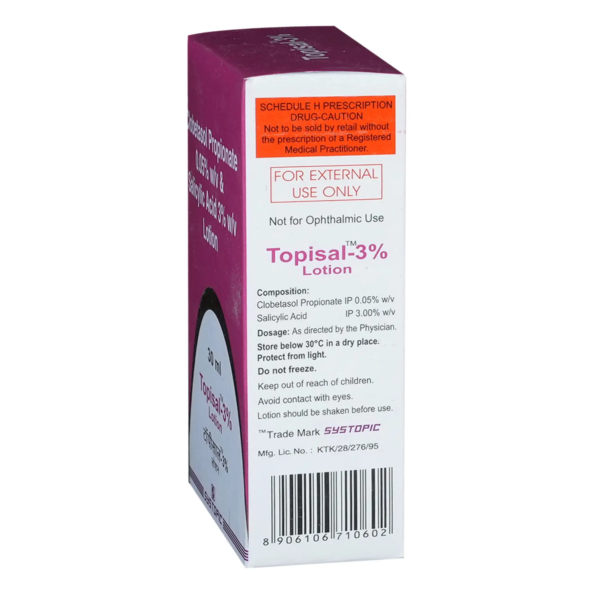 Topisal 3% Lotion is formulated with a blend of active ingredients that are effective in managing conditions such as eczema and psoriasis. This medicinal lotion aids in alleviating symptoms such as redness, itching, and inflammation associated with these skin conditions. It also assists in the removal of dead skin cells and promotes skin softness, helping to restore the skin’s natural appearance and feel. Usage should adhere strictly to the dosage and duration prescribed by a healthcare professional. Prior to application, it is essential to wash your hands thoroughly. Always refer to the product label for specific instructions regarding proper use. This product is intended solely for external application on affected areas. It is crucial to avoid exceeding the recommended usage, and patients should disclose any known allergies to their healthcare provider. Side effects can occur, including skin peeling, thinning, and local reactions such as burning, itching, and redness at the site of application. If any of these effects are persistent or if you experience other concerning symptoms that you believe may be related to this lotion, it is advisable to seek medical advice. Additionally, inform your healthcare provider if you are pregnant or have other health concerns. This lotion is generally considered safe for nursing mothers.