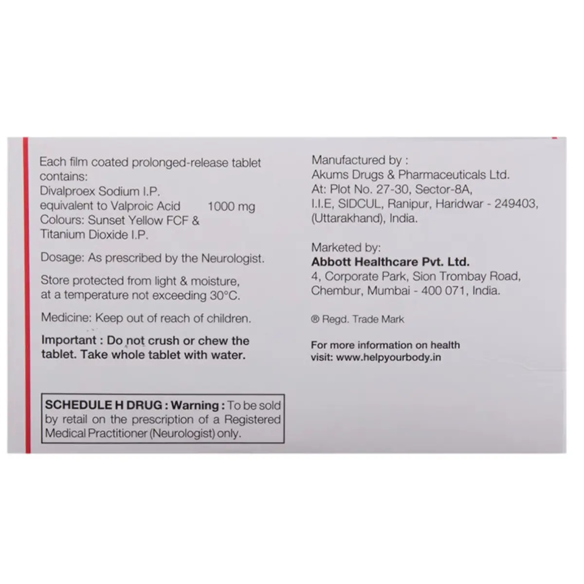 VALANCE OD1000 TAB PR is a therapeutic agent indicated for the management of conditions such as epilepsy, seizure disorders, bipolar disorder, manic episodes, trigeminal neuralgia, and migraines. Its mechanism of action involves the stabilization of electrical activity in the brain, which helps to prevent the occurrence of seizures and manage mood disorders. This medication may be prescribed alone or alongside other treatments, depending on individual patient needs. The appropriate dosage and administration schedule will be determined by your healthcare provider to ensure effective symptom management. While VALANCE OD1000 TAB PR can be taken with or without food, it is advisable to take it consistently at the same time each day to optimize its effectiveness. Users may not notice immediate effects, as it often requires several weeks to achieve desired outcomes. It is critical to adhere to the prescribed regimen and continue taking the medication for the entire duration recommended by your healthcare provider, even if you start to feel better, as discontinuing treatment abruptly can lead to a resurgence of symptoms. Regular intake is essential to prevent the risk of seizures associated with missed doses. Patients should be aware that prolonged use of this medication may lead to potential side effects such as decreased bone density, increasing the likelihood of fractures. In rare instances, it can also induce suicidal thoughts; thus, any significant mood changes should be reported to a healthcare professional.