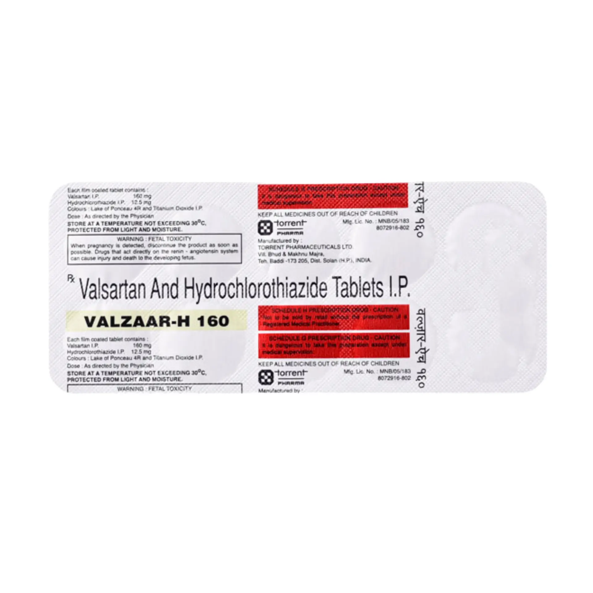 Valzaar-H 160 Tablet combines two medications to effectively manage high blood pressure through various mechanisms. Uncontrolled high blood pressure can lead to significant health risks, including heart attacks, strokes, and renal failure. This medication can be taken with or without meals, and the dosage will be tailored to your specific health condition and individual response to the treatment. Consistency is key; try to take it at the same time daily. It is crucial to continue using this medication until directed otherwise by your healthcare provider, as discontinuation can elevate the risk of serious cardiovascular events due to the silent nature of hypertension. The tablet contains a diuretic, which increases urinary output; therefore, it is advisable to avoid taking it close to bedtime to minimize nighttime bathroom trips. Regular use is essential for optimal effectiveness, even if you feel fine. While many users may experience dizziness as a common side effect, other less frequent effects may include fatigue, nausea, diarrhea, headaches, and a drop in blood pressure. Frequent urination is a therapeutic effect due to the hydrochlorothiazide component rather than a side effect. Some rare adverse reactions can occur, such as increased intraocular pressure leading to potential vision impairment if untreated. Review the accompanying patient information leaflet for more details, and promptly discuss any persistent or concerning side effects with your healthcare professional. Adjustments to your dosing regimen or a switch to an alternative medication may be necessary. It is advised to avoid potassium supplements and salt substitutes unless prescribed. The use of this medication is contraindicated during pregnancy and lactation, and individuals with kidney or liver conditions, heart disease, or diabetes should consult their doctor prior to use. Alcohol consumption can exacerbate low blood pressure and lead to additional side effects.