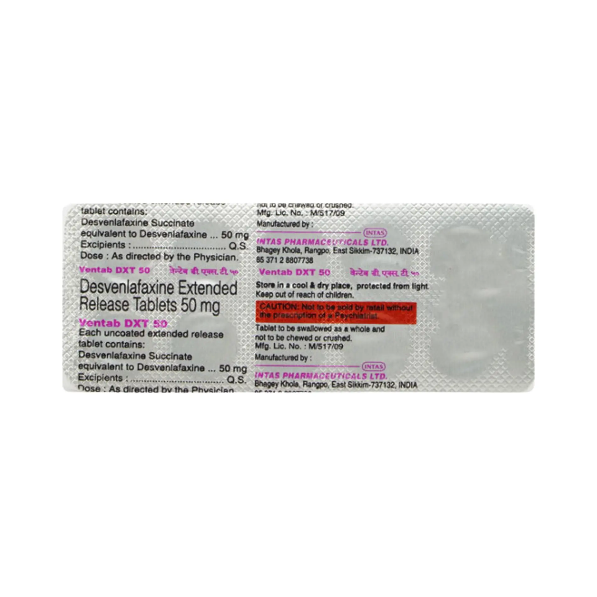 Ventab Dxt 50 mg Extended Release Tablet is a medication prescribed for the management of depression. It works by enhancing the levels of certain neurotransmitters, specifically serotonin and noradrenaline, in the brain which contribute to mood regulation and provide a calming effect. This action helps alleviate symptoms of depression by promoting relaxation in the nervous system. The tablet is intended to be taken orally, and it may be consumed with or without food. For optimal effectiveness, it should be administered at the same time each day, ensuring a steady concentration of the medication in your bloodstream. If a dose is missed, it should be taken promptly once remembered. However, doses should not be skipped, and the complete treatment regimen should be followed even if improvement is noted. Abruptly discontinuing this medication without medical consultation is not advisable, as it may exacerbate symptoms. Commonly reported side effects include nausea, vomiting, insomnia, and constipation. Additionally, there may be a rise in blood pressure, especially in the initial month of use, so regular monitoring of blood pressure is advisable. Those taking this medication may experience dizziness and drowsiness, so it is recommended to refrain from driving or undertaking tasks that require full mental acuity until one is aware of how the medication affects them. It is critical to communicate any significant mood changes to your healthcare provider, as these could potentially lead to suicidal ideation.